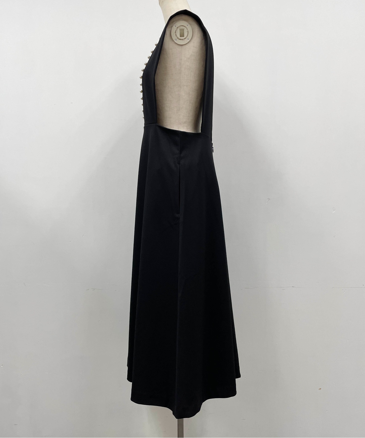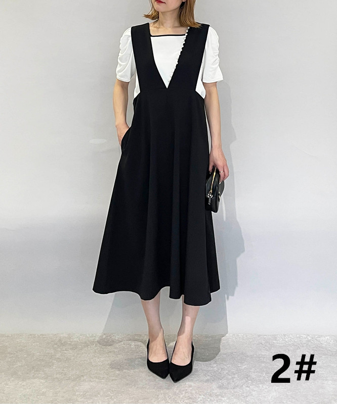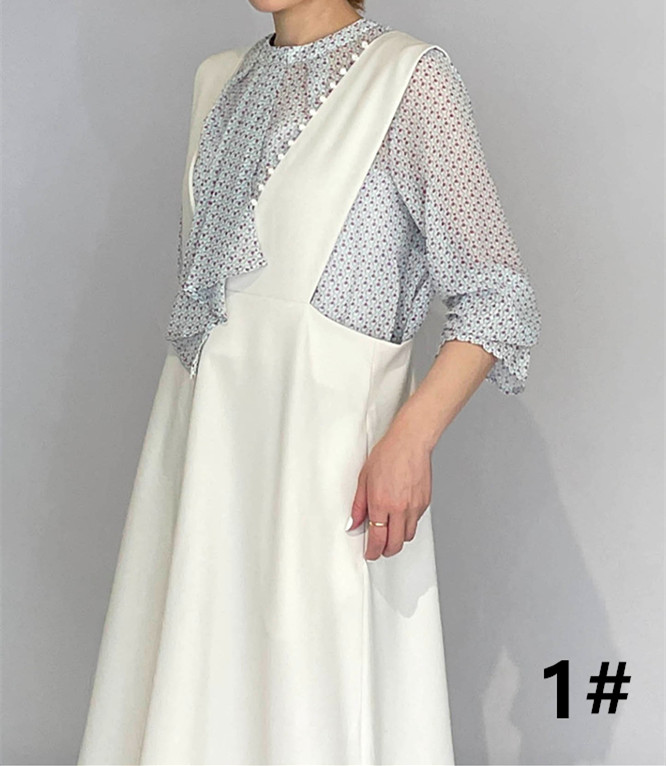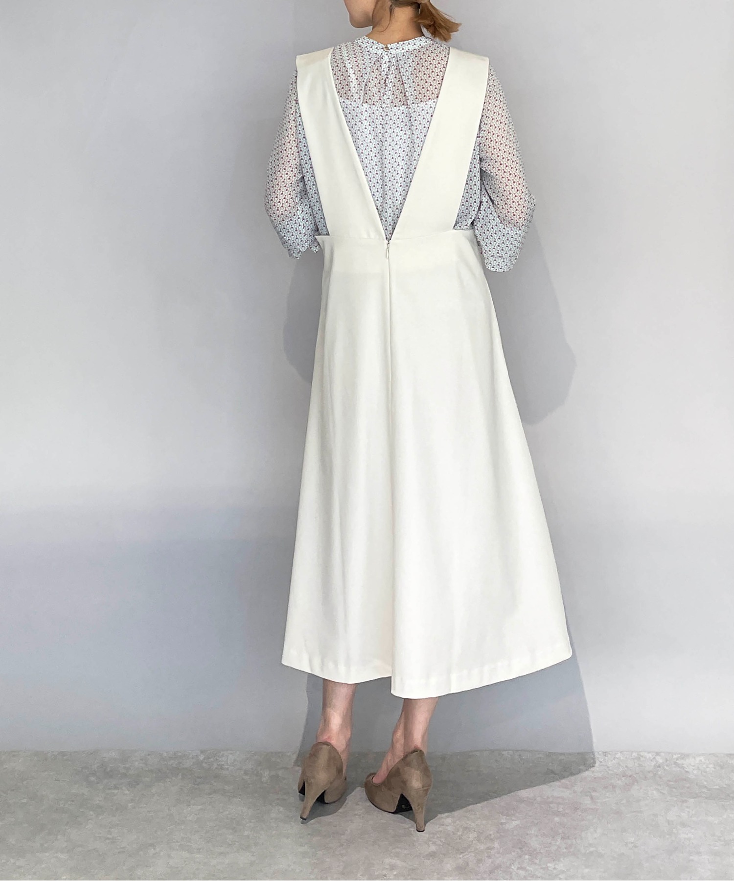上品な花柄ブラウスと白いサロペットが可愛いロングワンピース。