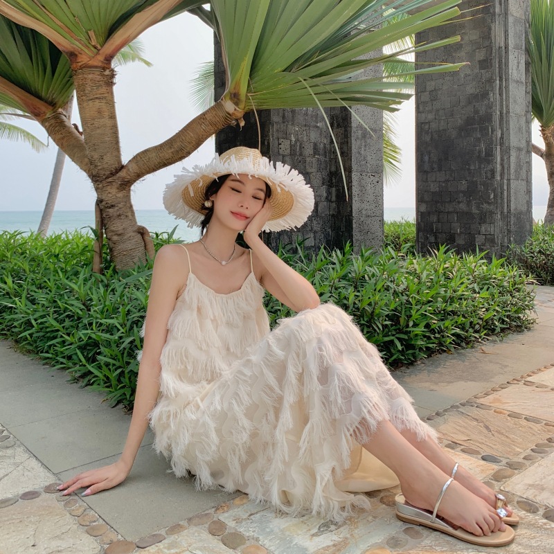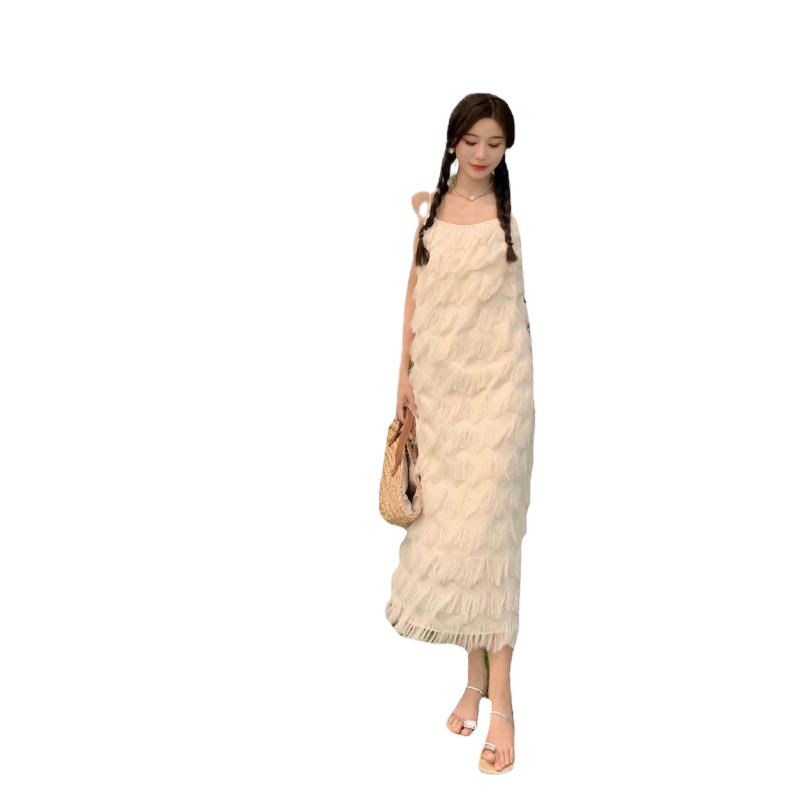 エレガントなフリンジデザインが美しいキャミタイプのロングワンピースです。