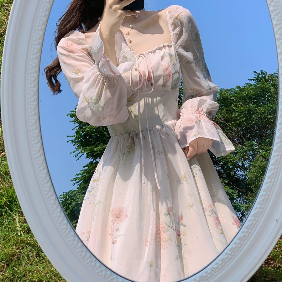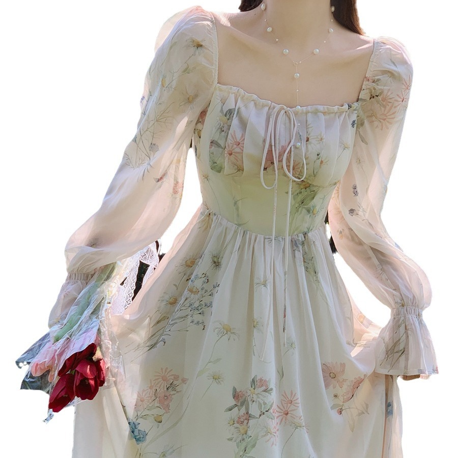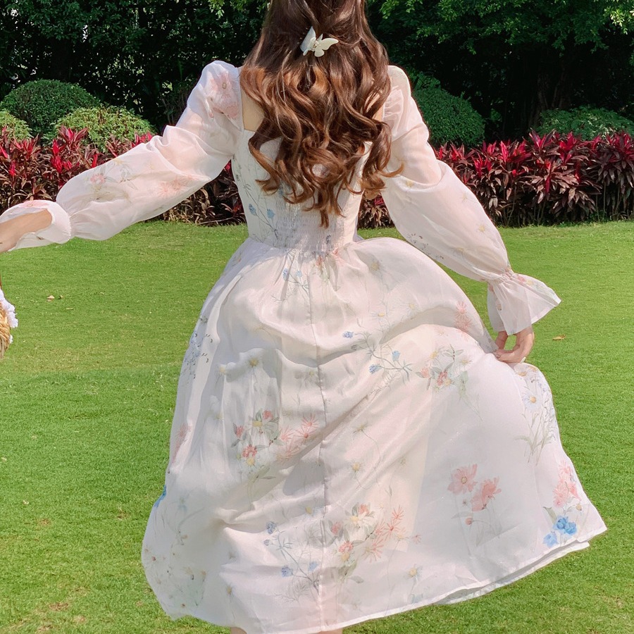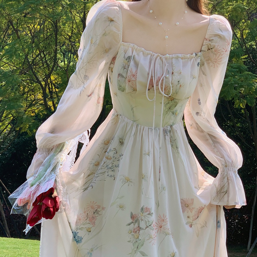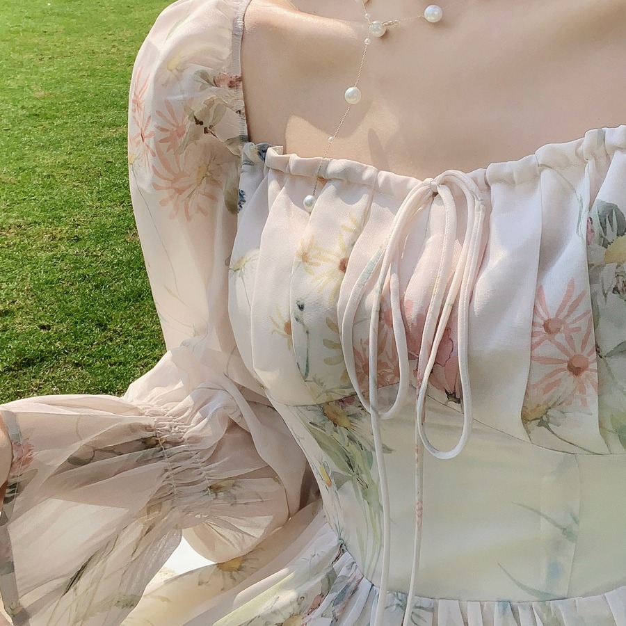 上品な花柄が美しいレースの袖が特徴的なロングワンピースです。