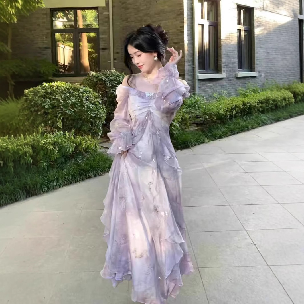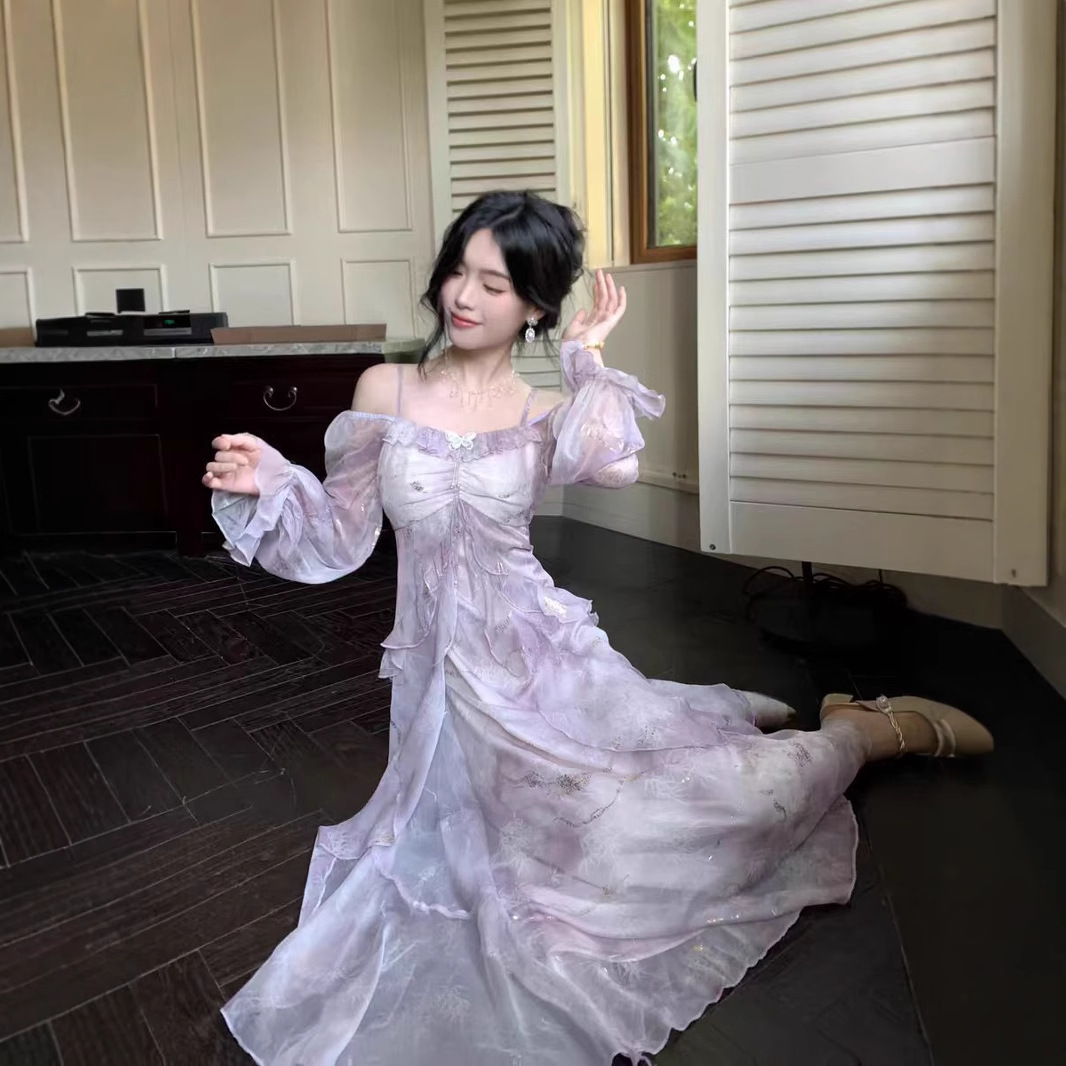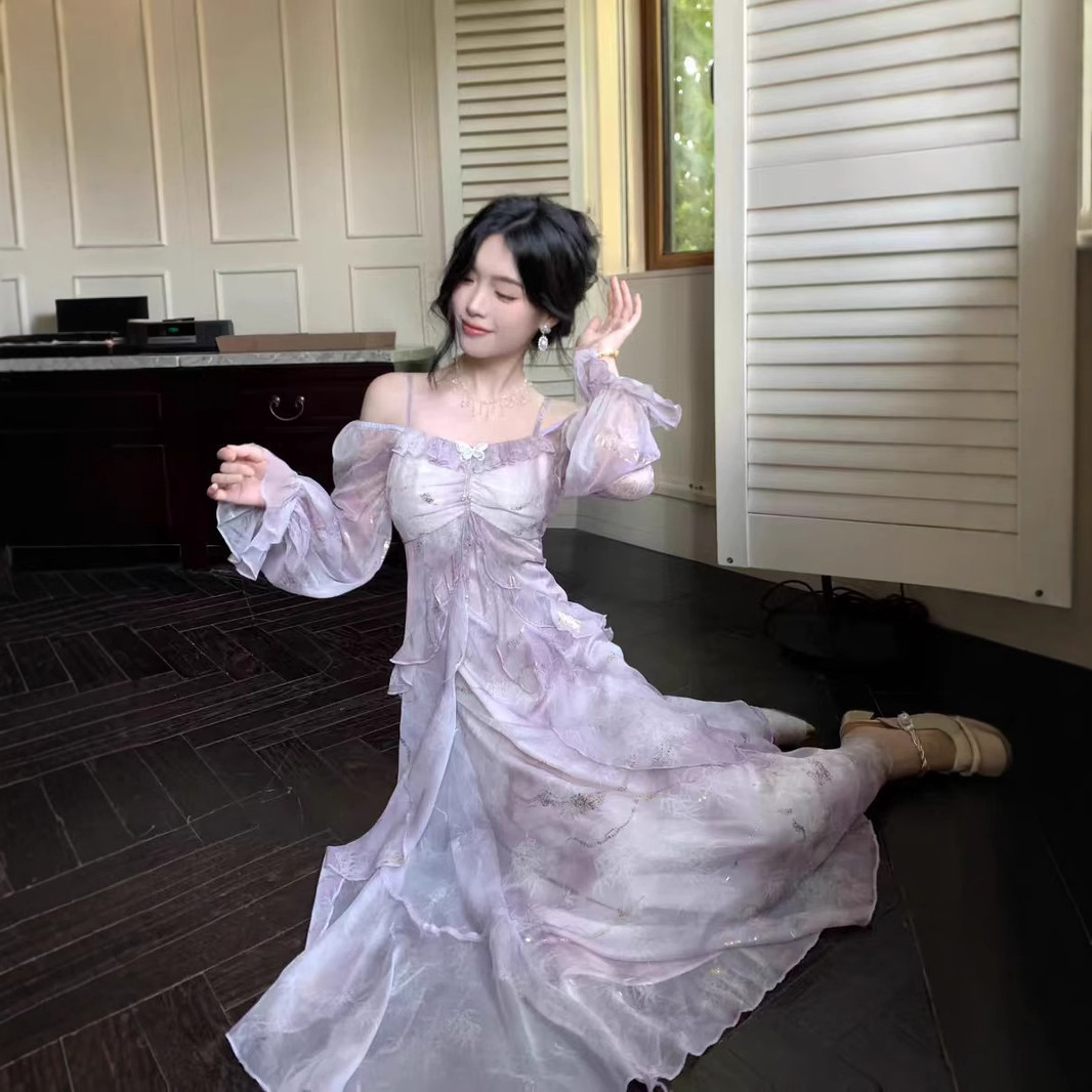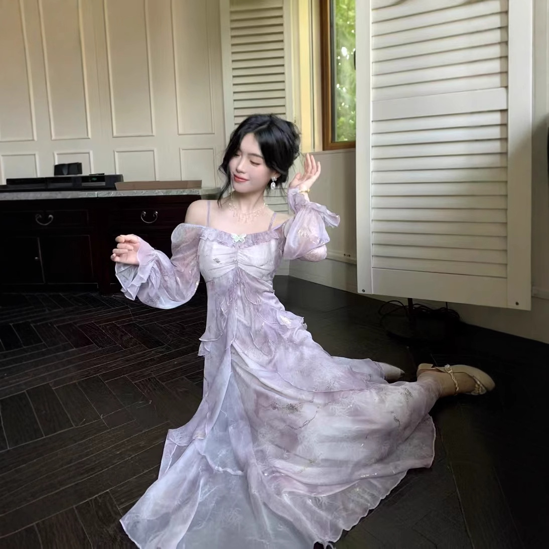 透け感のある軽やかな生地と優雅なパフスリーブが特徴的で、