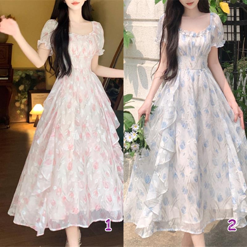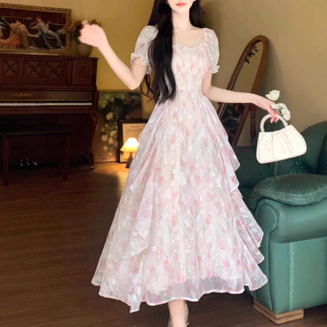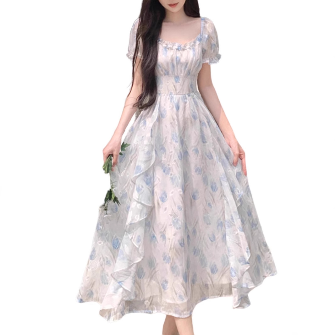 優雅なパフスリーブと多層のフリルデザインで女性らしさを演出。