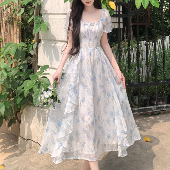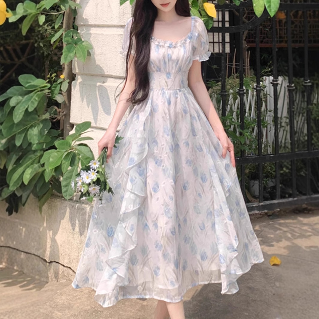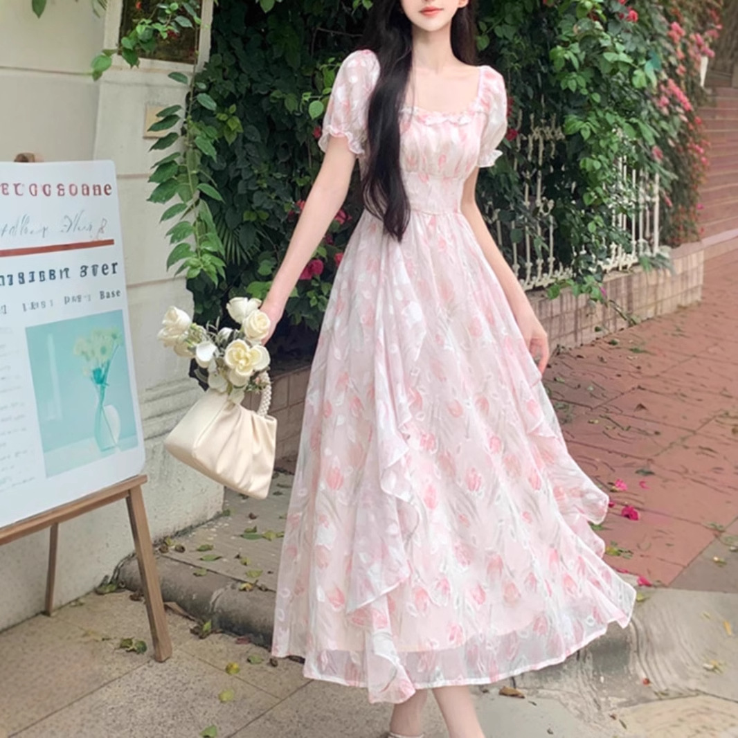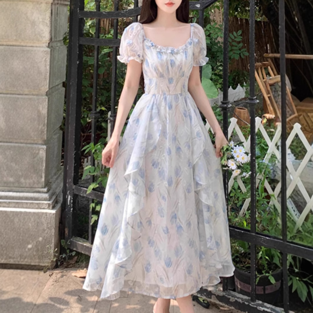 優雅なパフスリーブと多層のフリルデザインで女性らしさを演出。