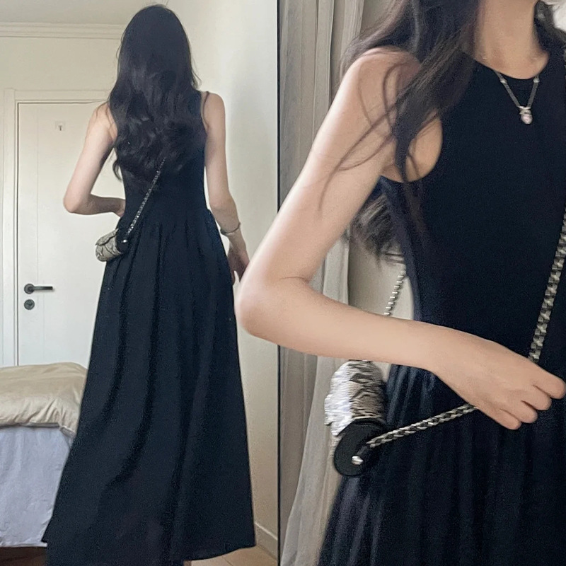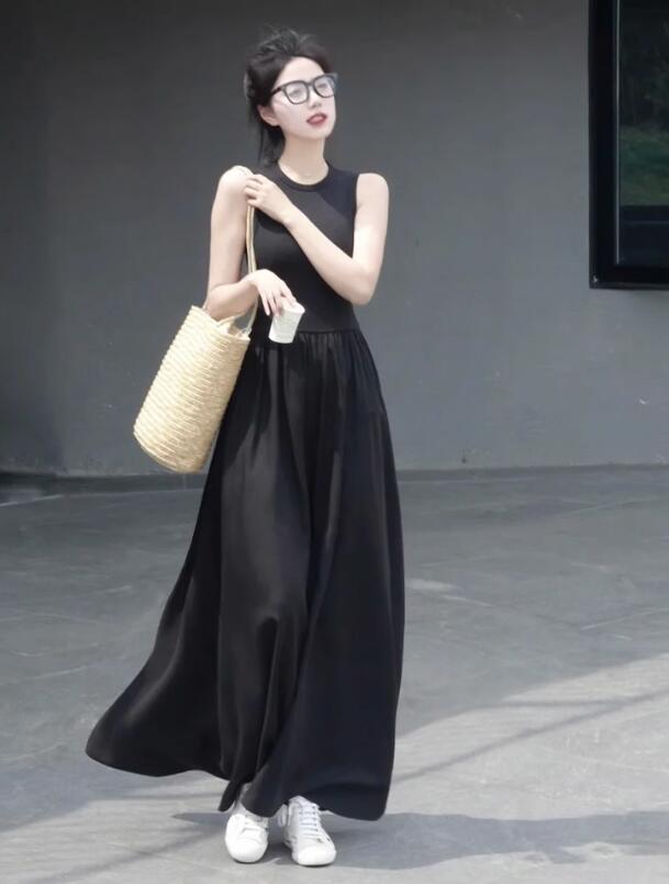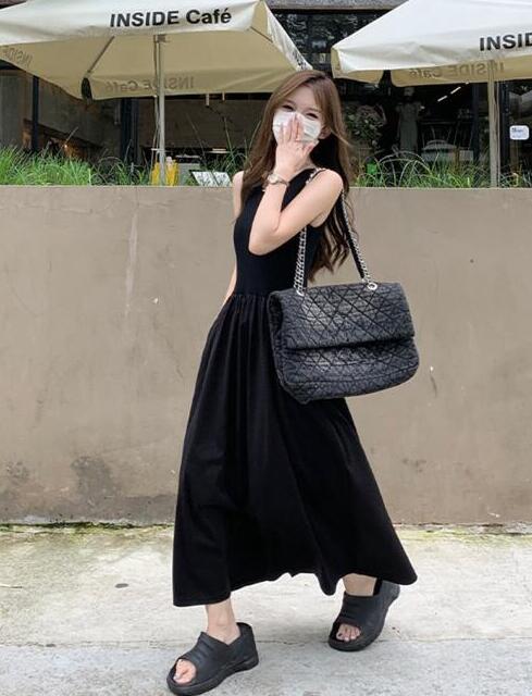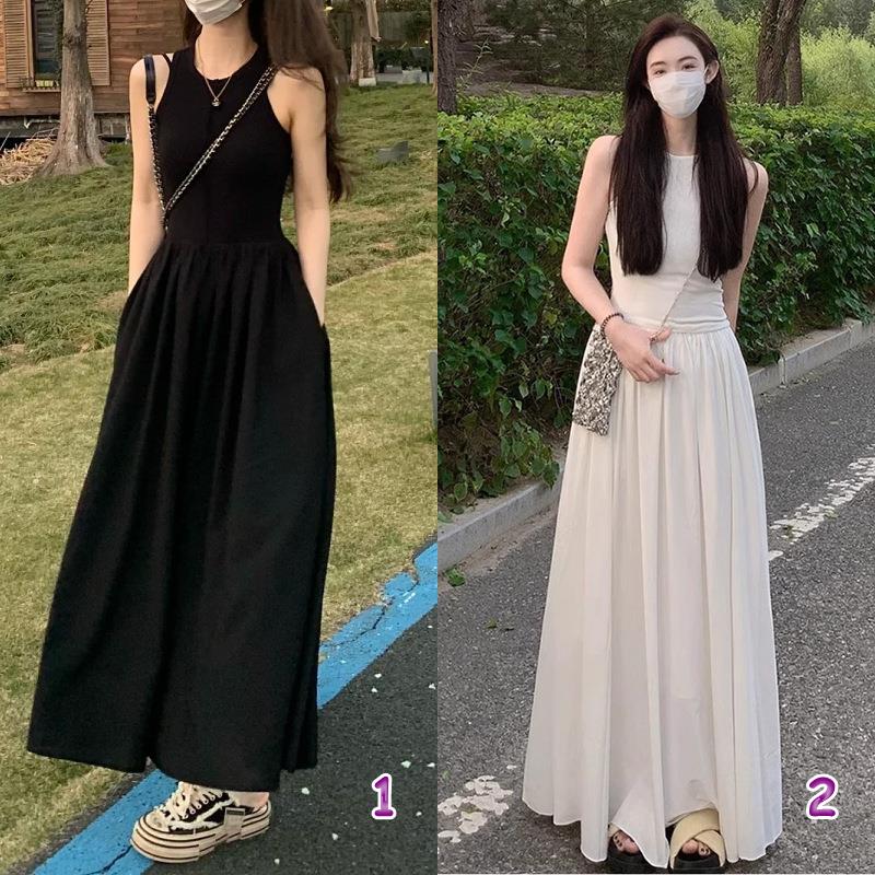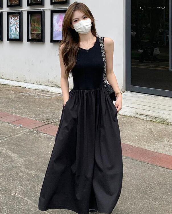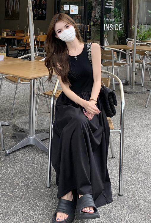 シンプルで上品な無地のノースリーブロングワンピースです。