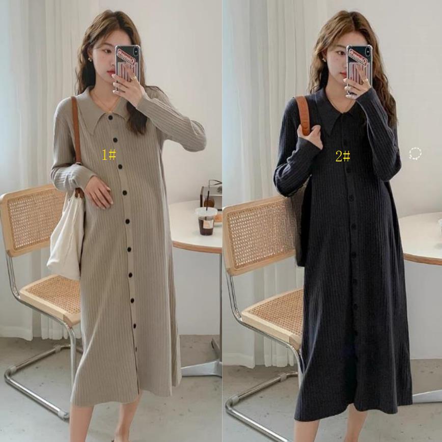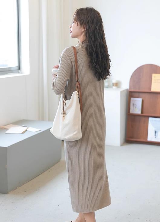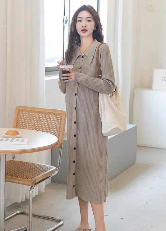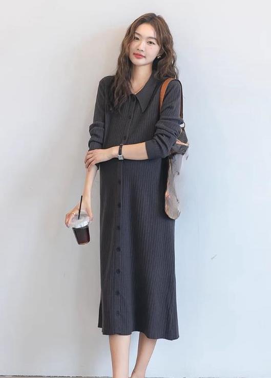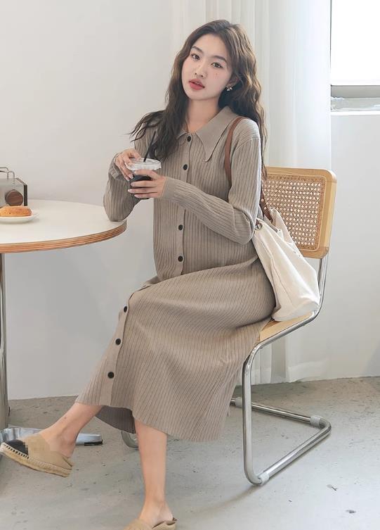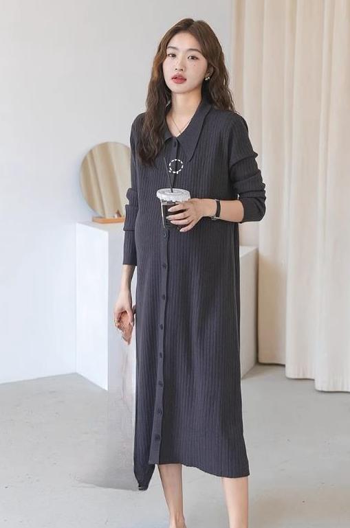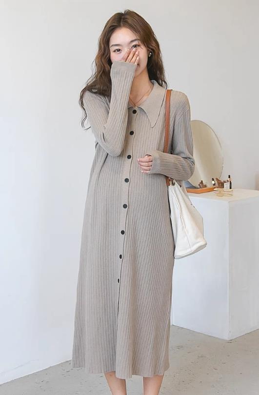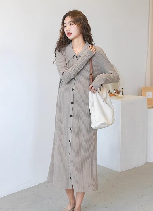 エレガントなニット素材のシャツタイプロングワンピースです。