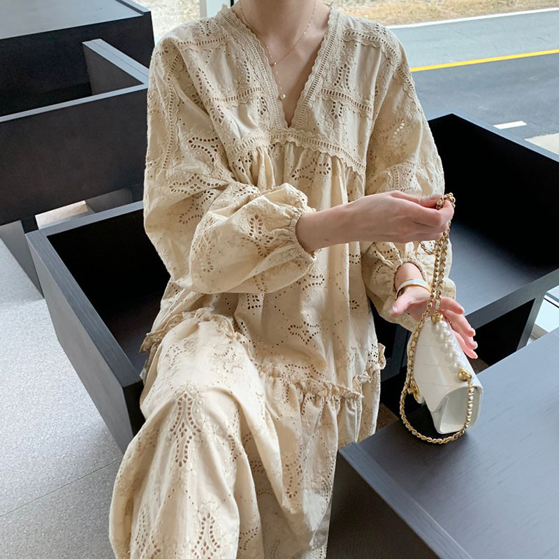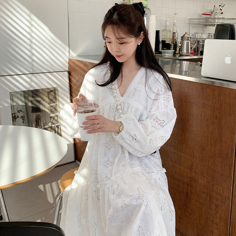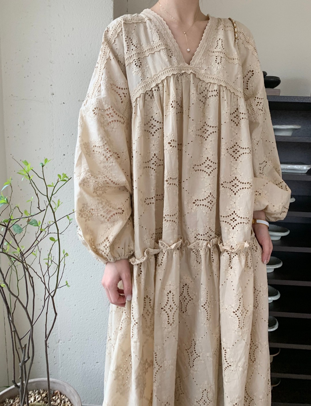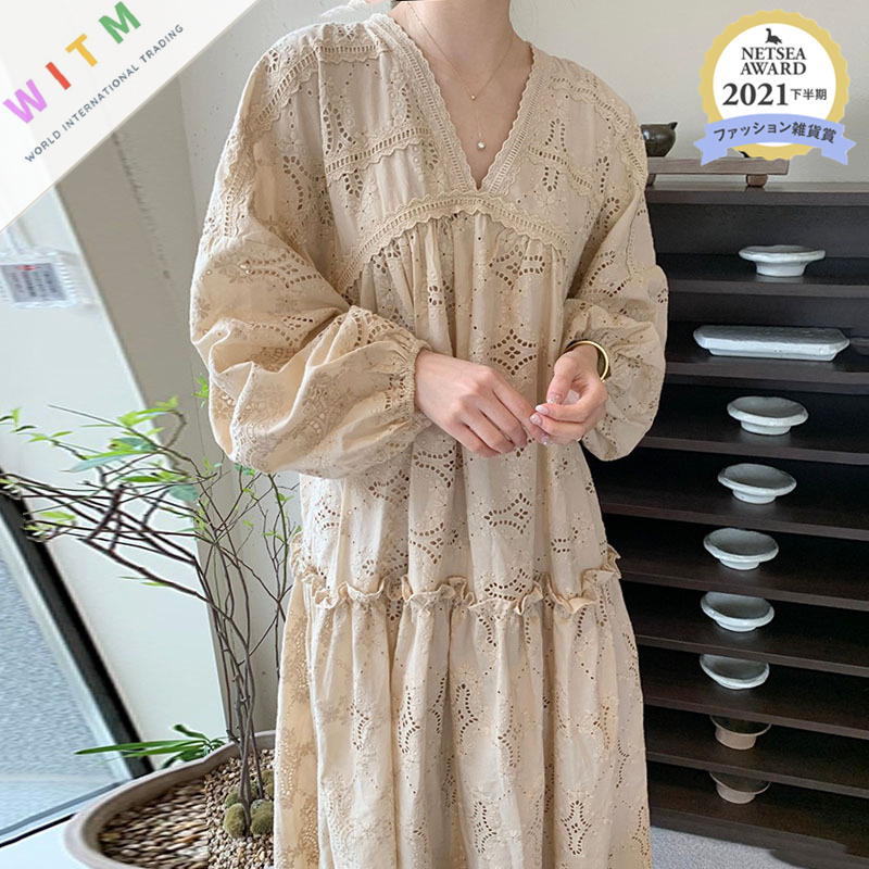 繊細なレース刺繍が美しいゆったりとしたデザインのロングワンピースが登場しました。