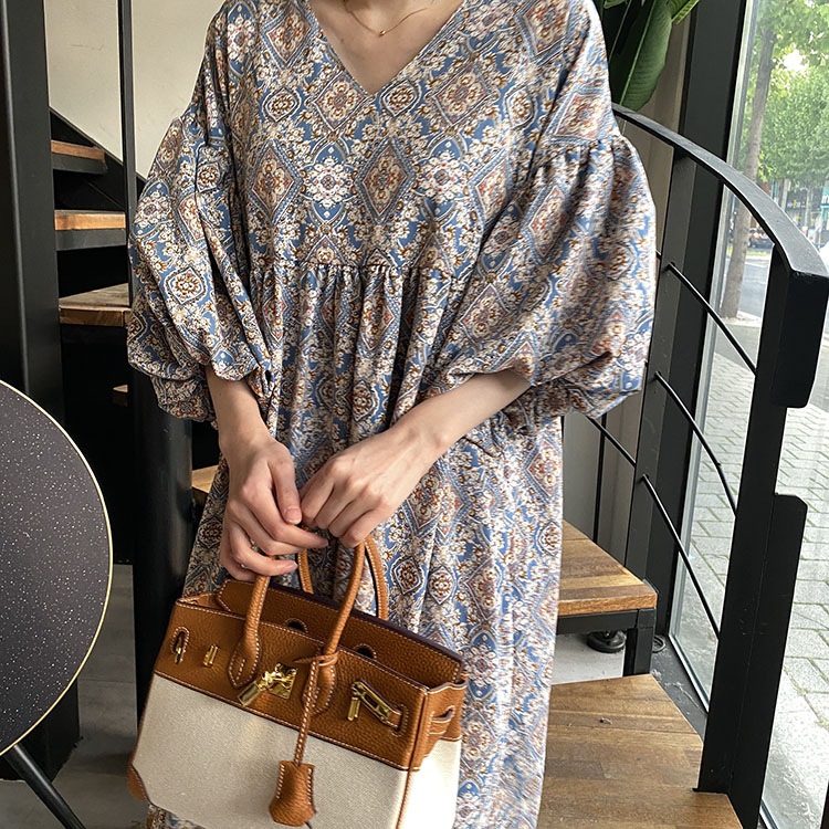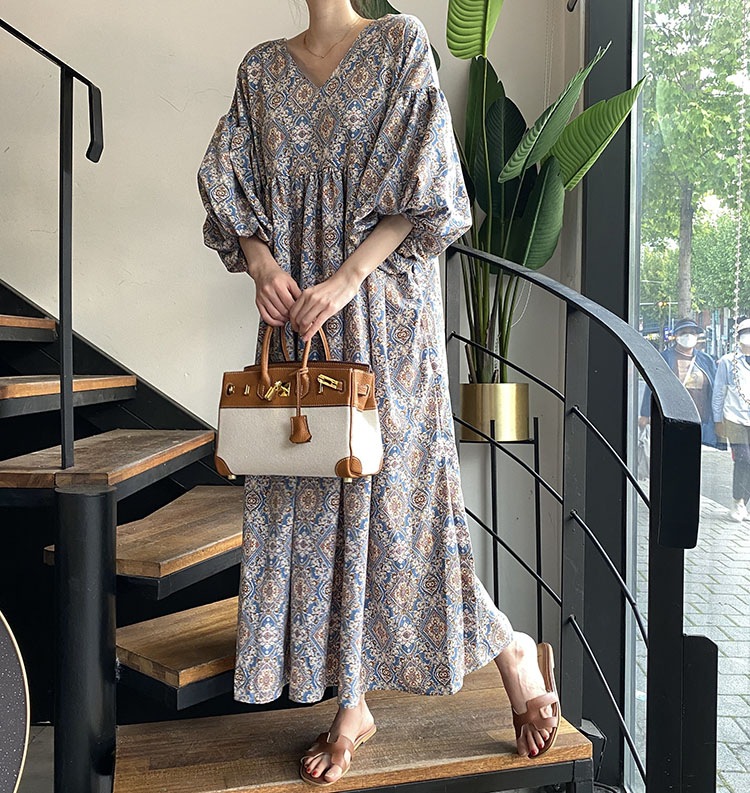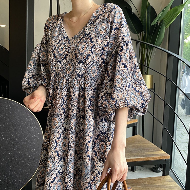 民族風の美しい柄とゆったりとした袖が特徴的なロングワンピースです。