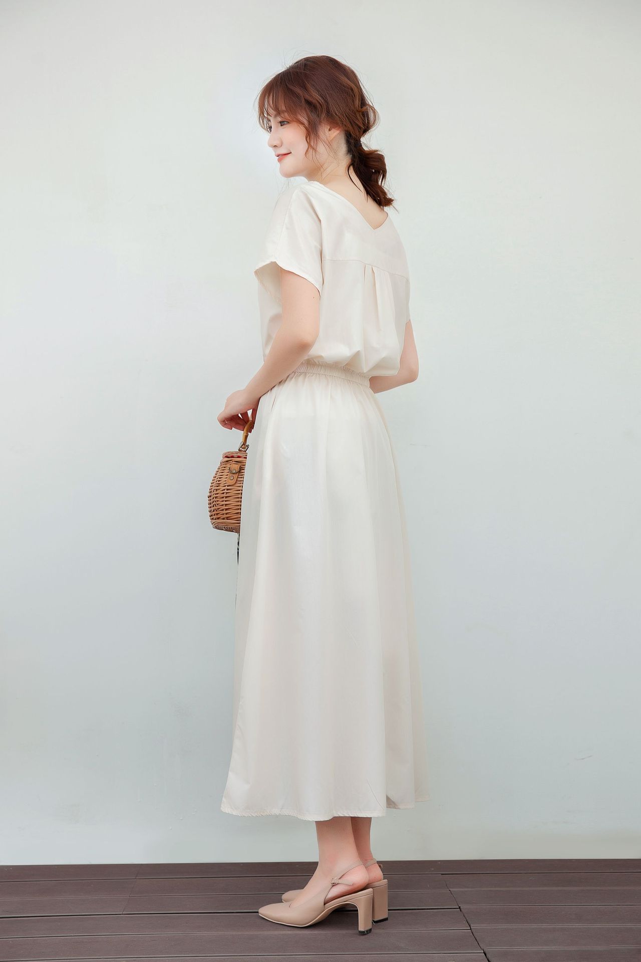 大人上品なイメージで着こなせる半袖マキシワンピース。