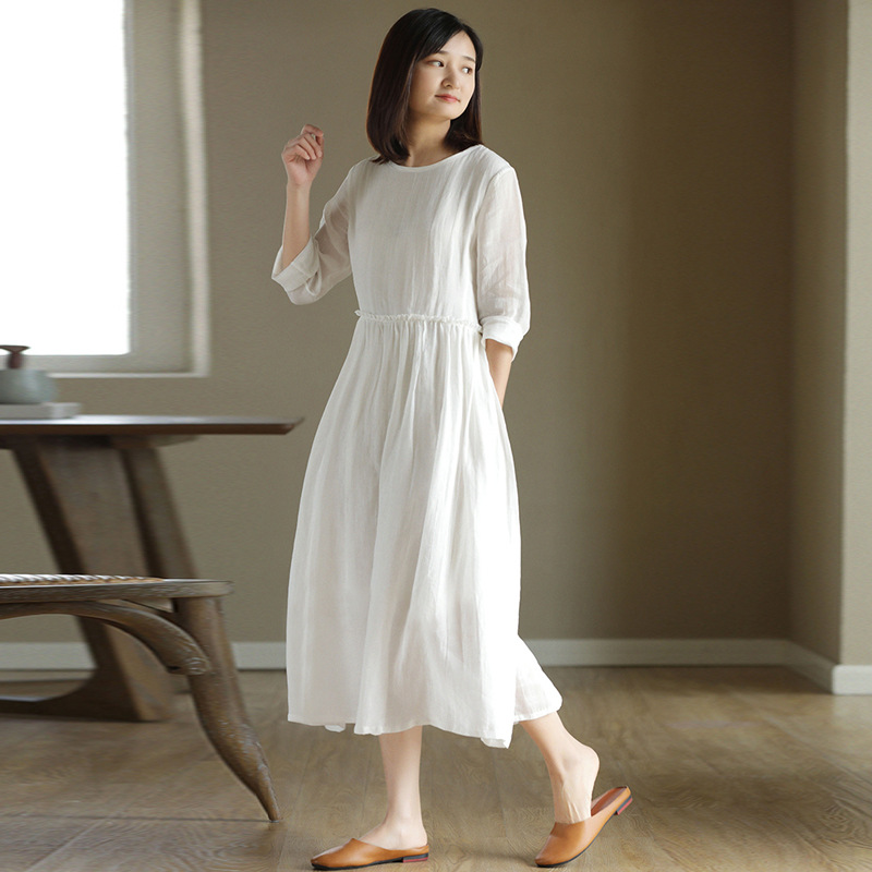 上品な印象を演出するフレアシルエットのロングワンピース。