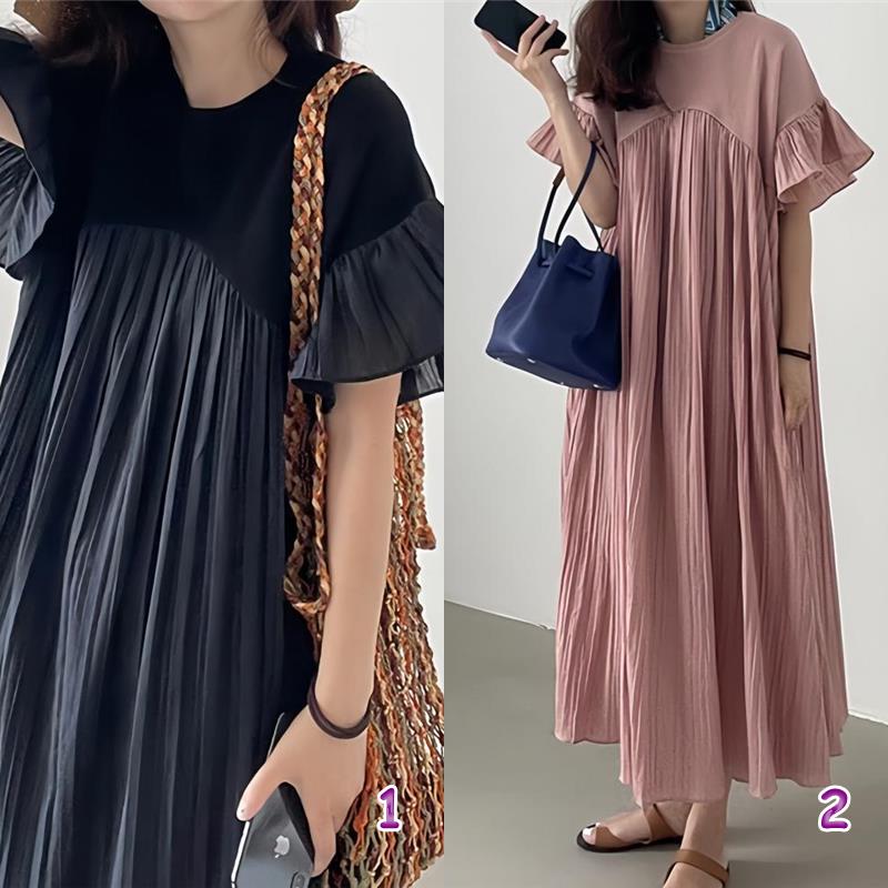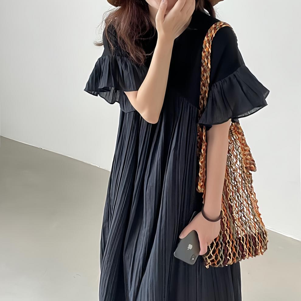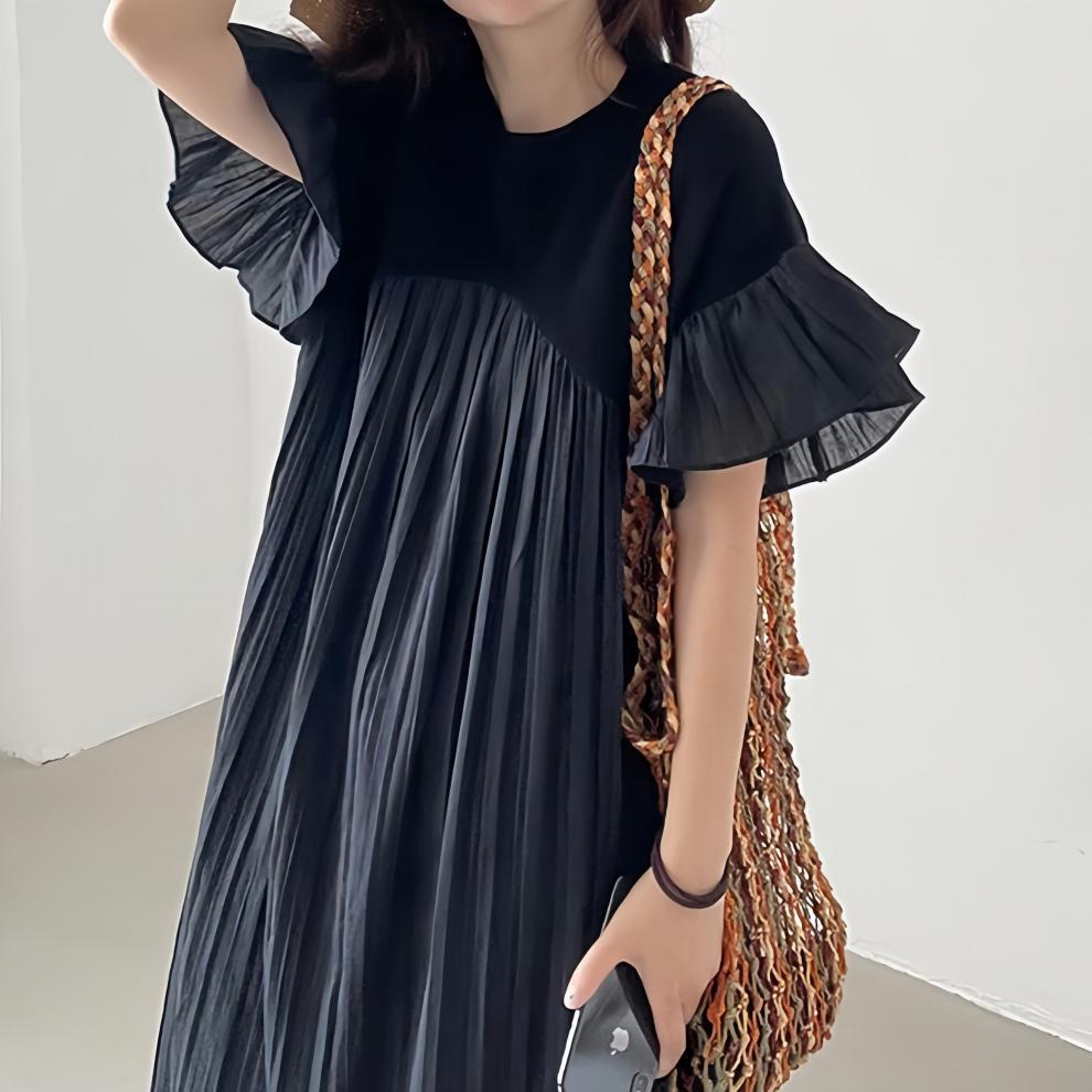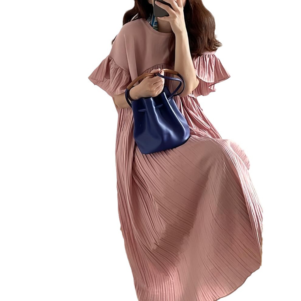 上品なフリル袖が印象的なプリーツロングワンピースです。