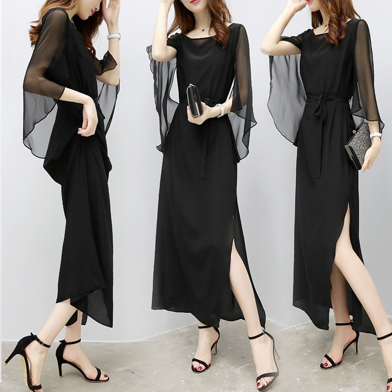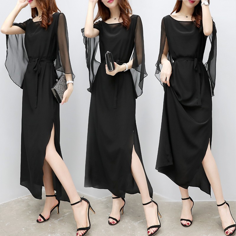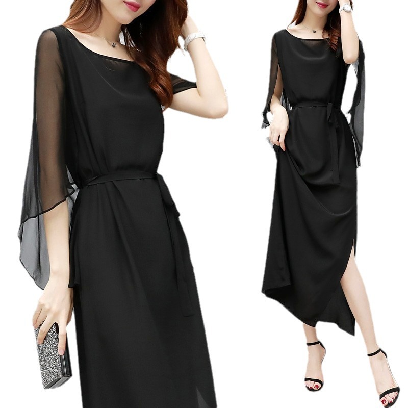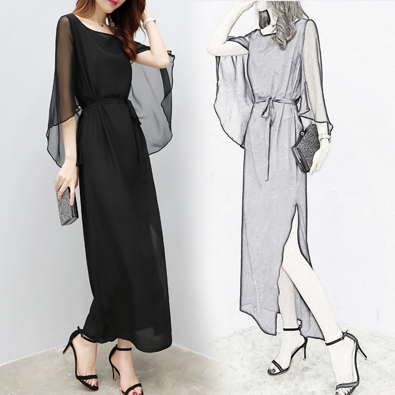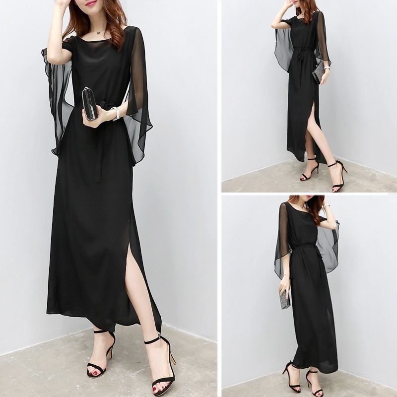 上品なレース素材と透け感のあるシフォン袖が美しいロングワンピース。 大人の女性らしさを演出するブラックカラーで、ウエストリボンでスタイルアップ効果も抜群。 サイドスリット入りで歩きやすく、特別な日から普段使いまで幅広くお使いいただけます。