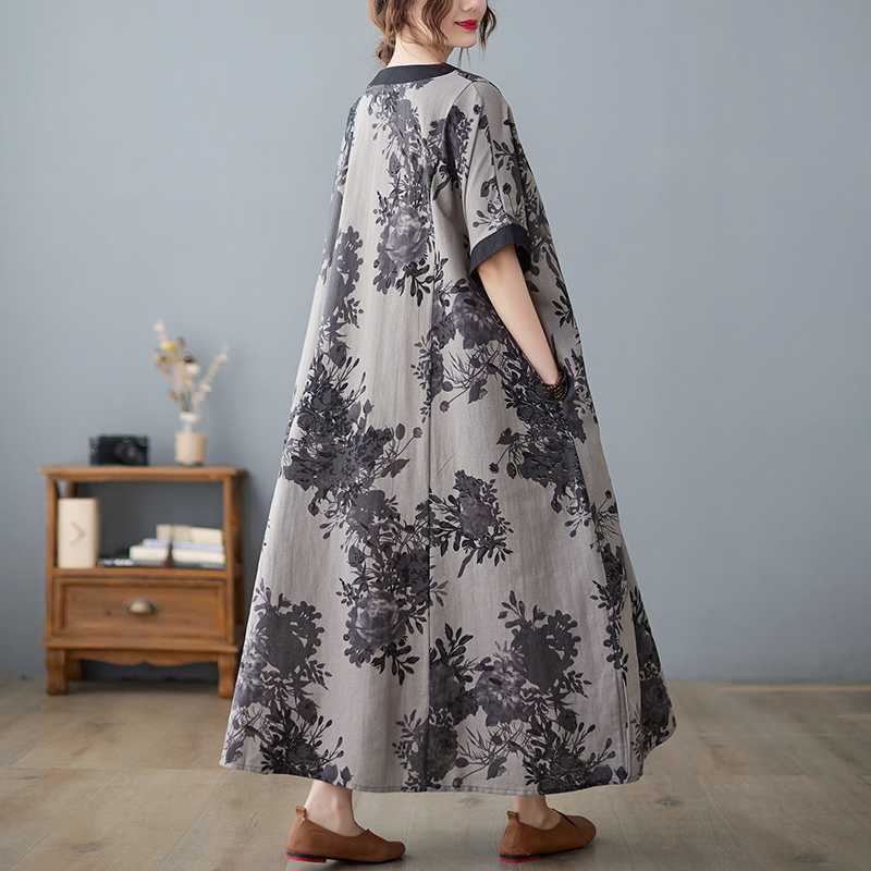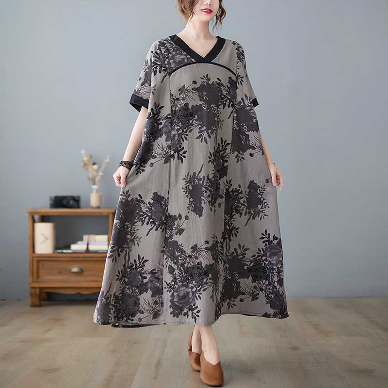 上品な花柄が美しいフレアシルエットの半袖ロングワンピースです。
