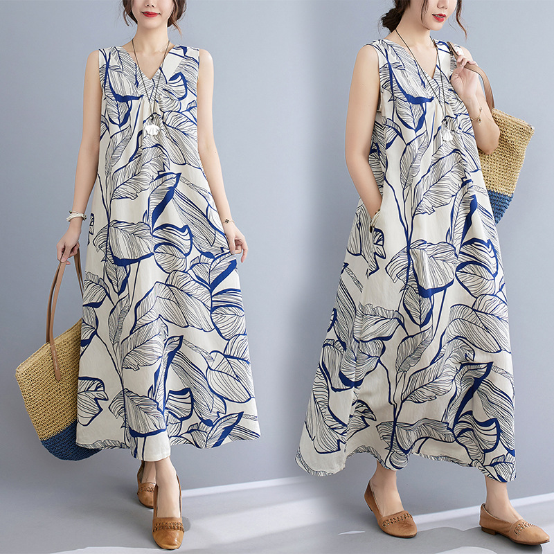 上品な葉柄プリントが美しいノースリーブのロングワンピースです。
