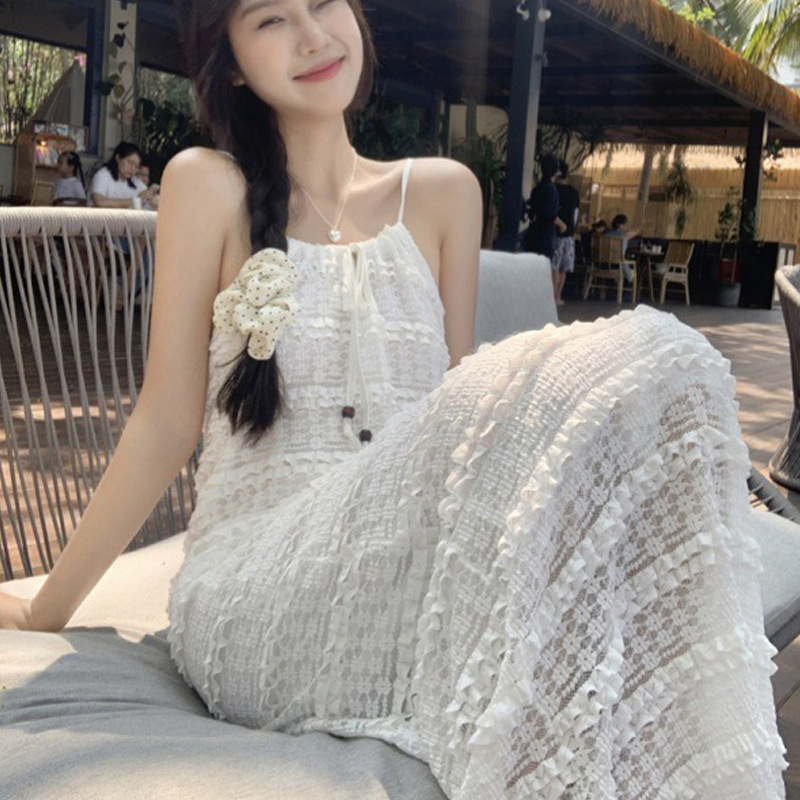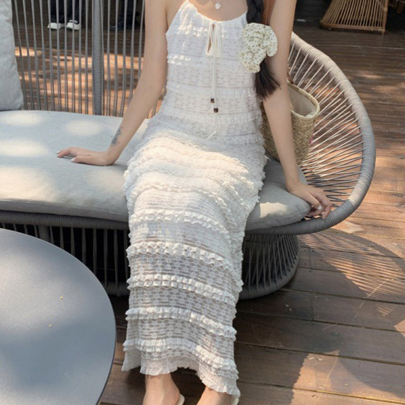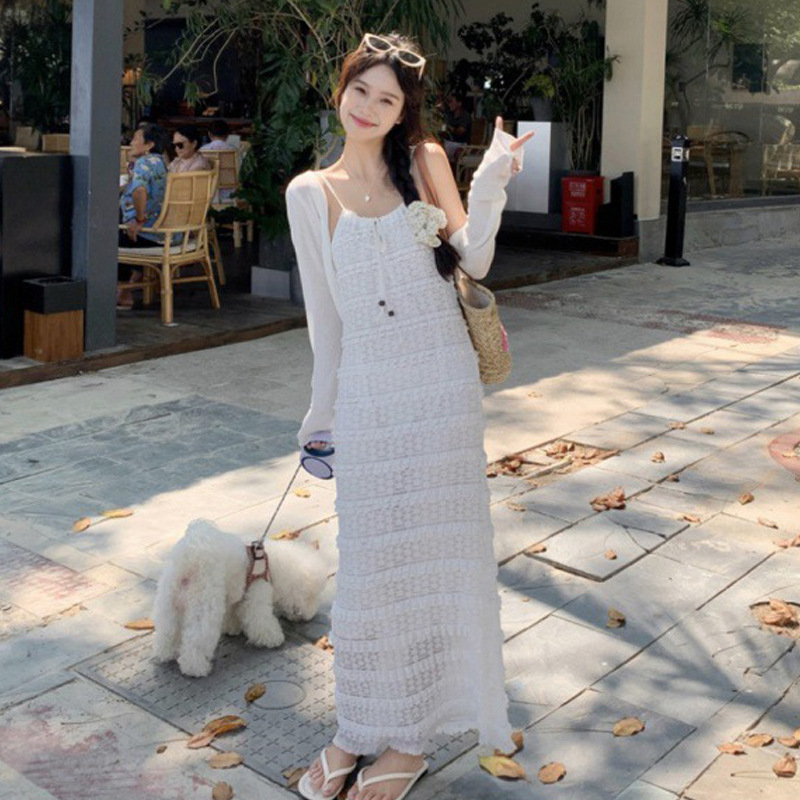上品なレース編みが美しいキャミタイプのロングワンピース。