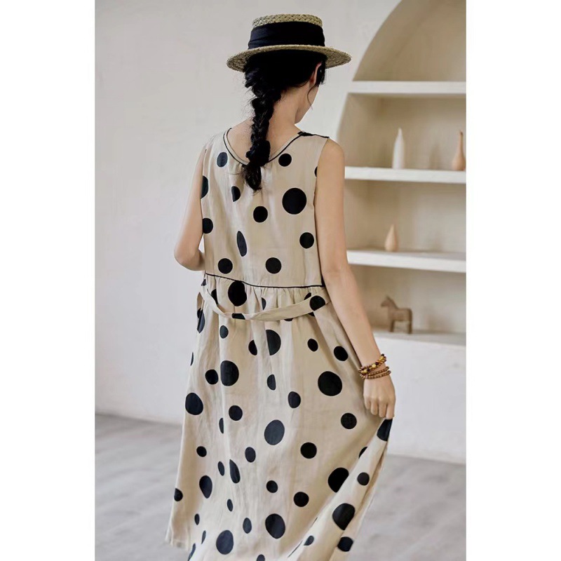 上品な水玉柄が印象的なノースリーブのロングワンピースです。