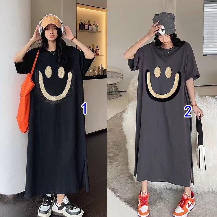 可愛いスマイル柄が印象的なスウェット素材のロングワンピースです。