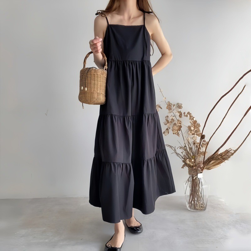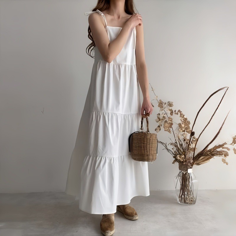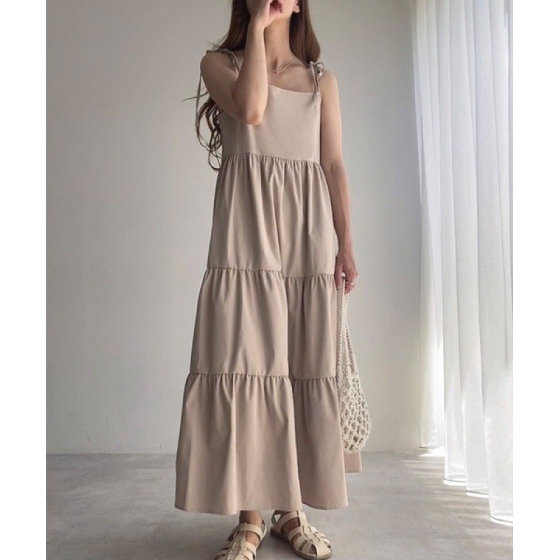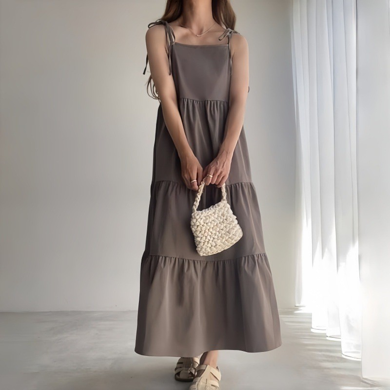 上品なベージュとグレーの無地カラーが魅力的なキャミタイプのロングワンピースです。