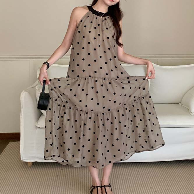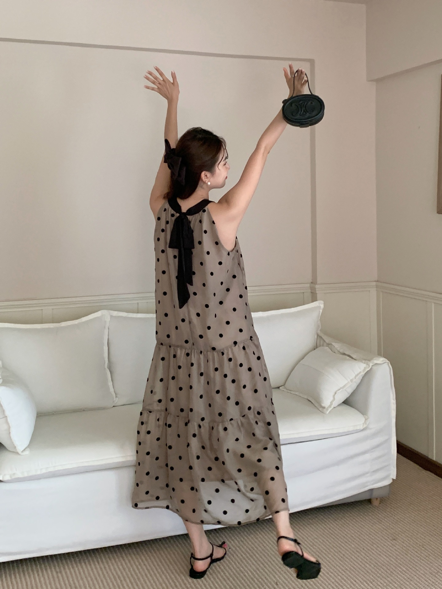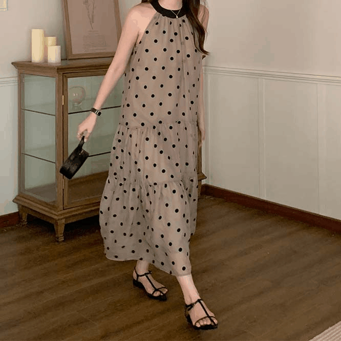 上品なドット柄が印象的なノースリーブのロングワンピースです。