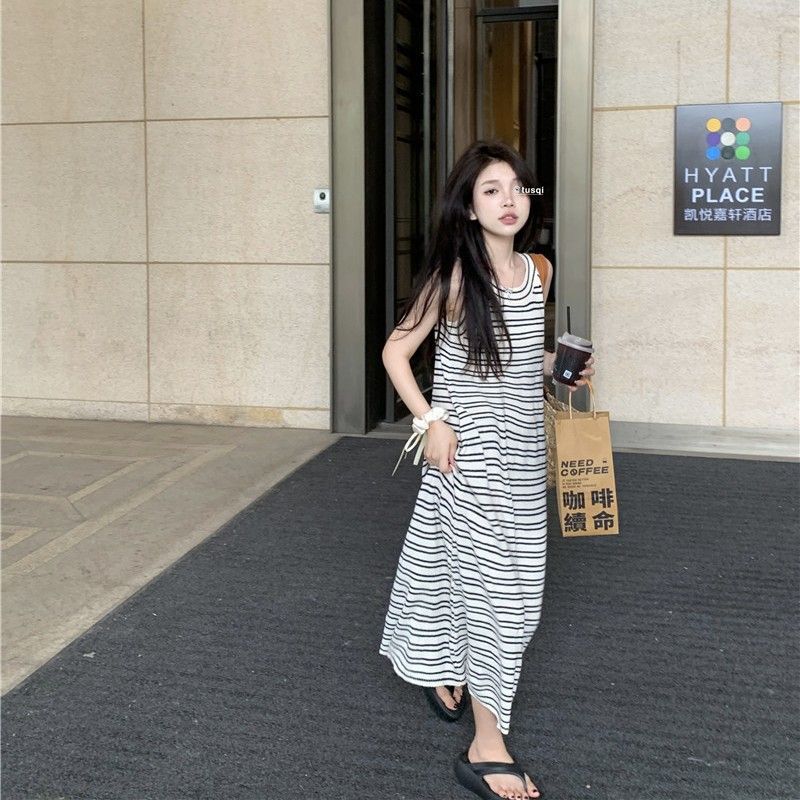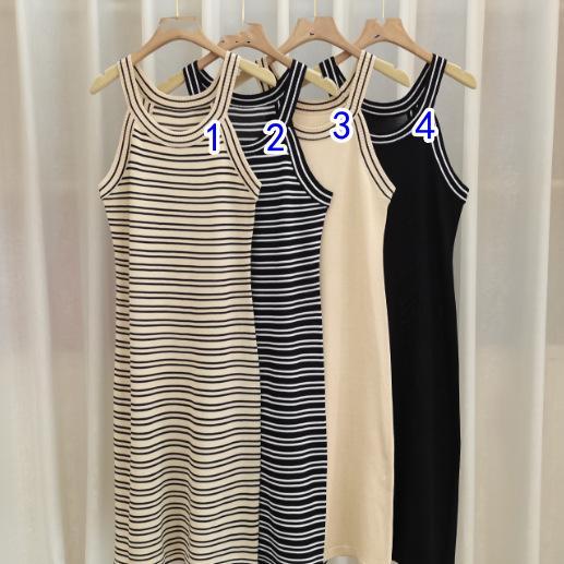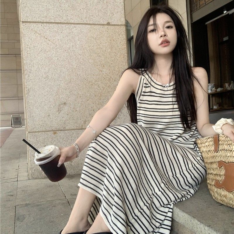 上品なストライプ柄が魅力的なノースリーブのニットワンピースです。