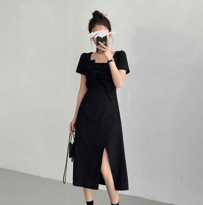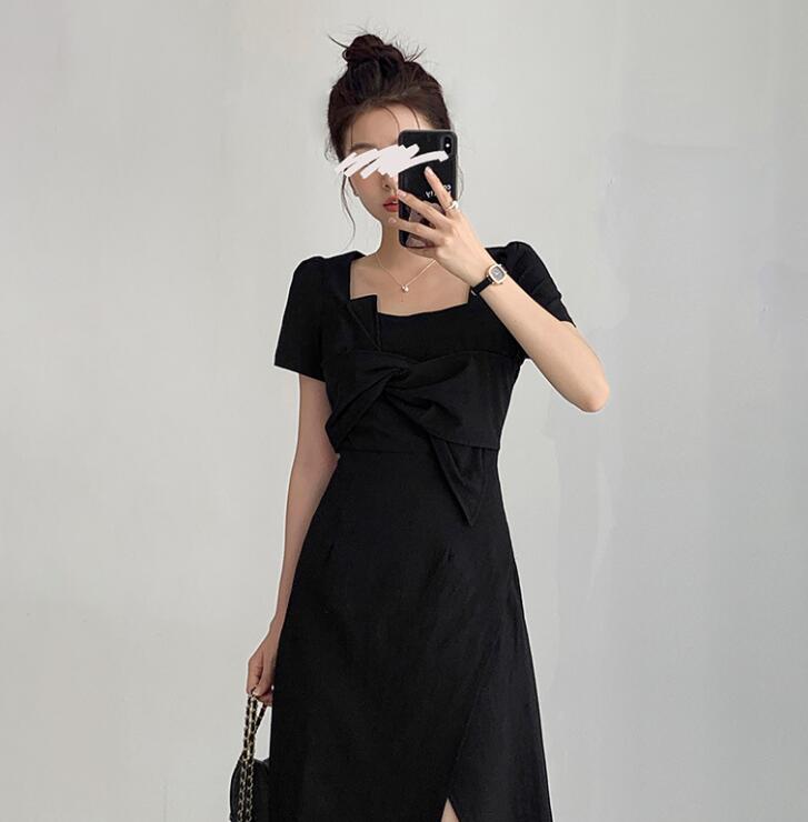 胸元のリボンディテールと美しいスリットが女性らしさを演出します。