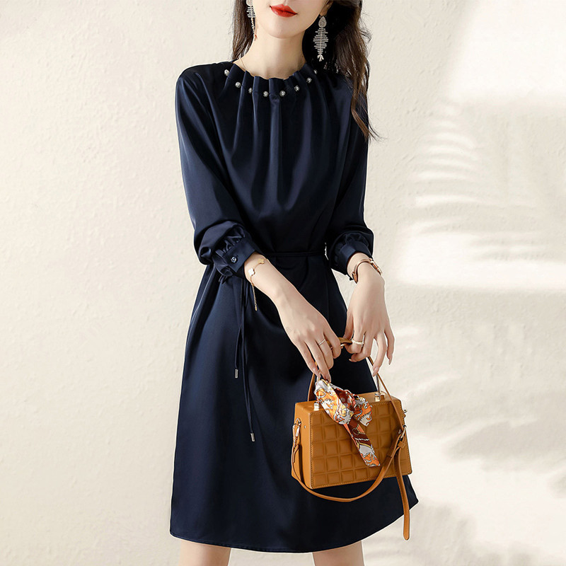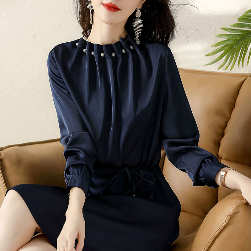 上品なパールビーズが首元を華やかに演出する韓国風シャツワンピース。