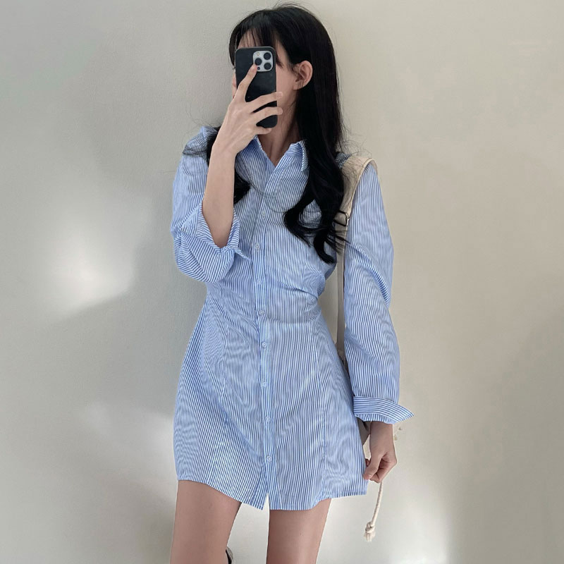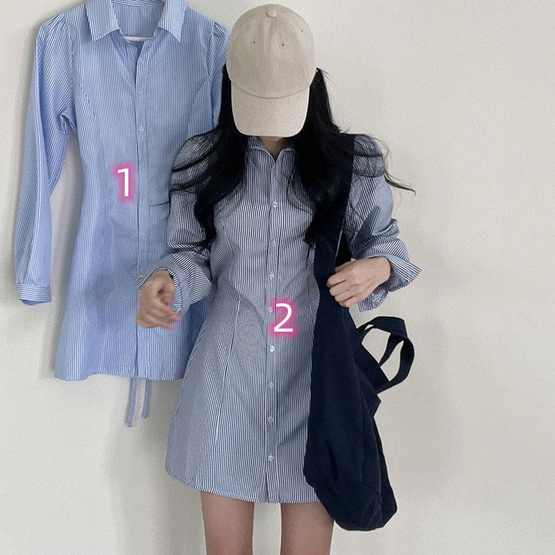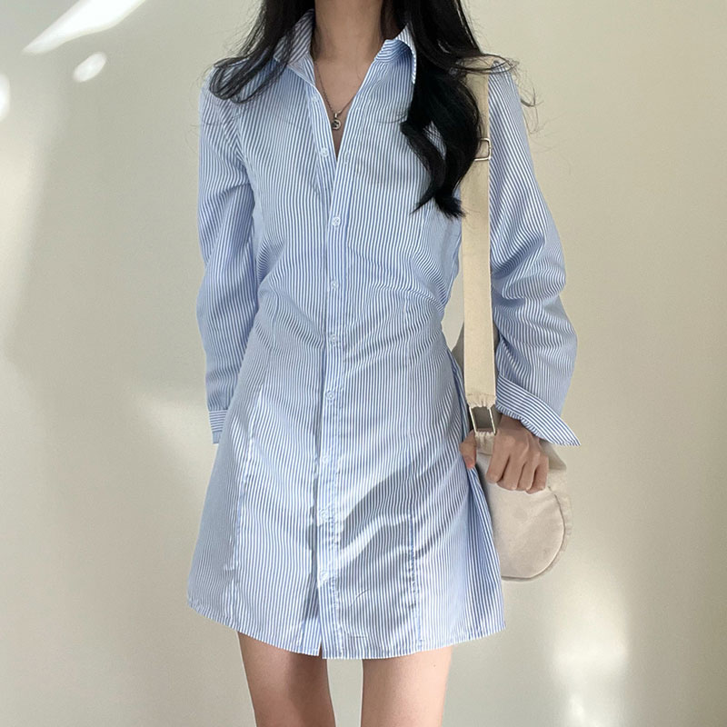 上品なストライプ柄が魅力的な長袖シャツワンピースです。