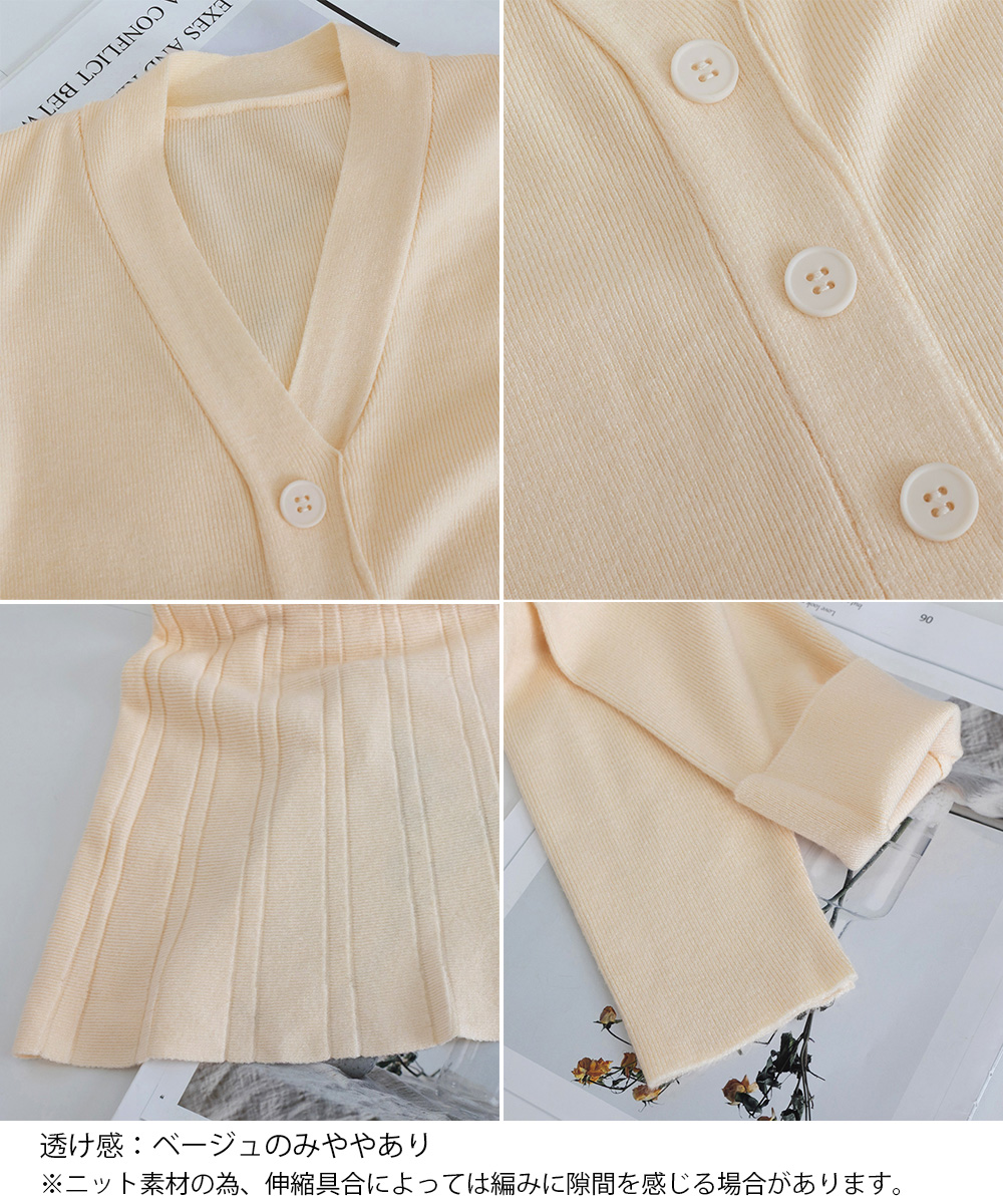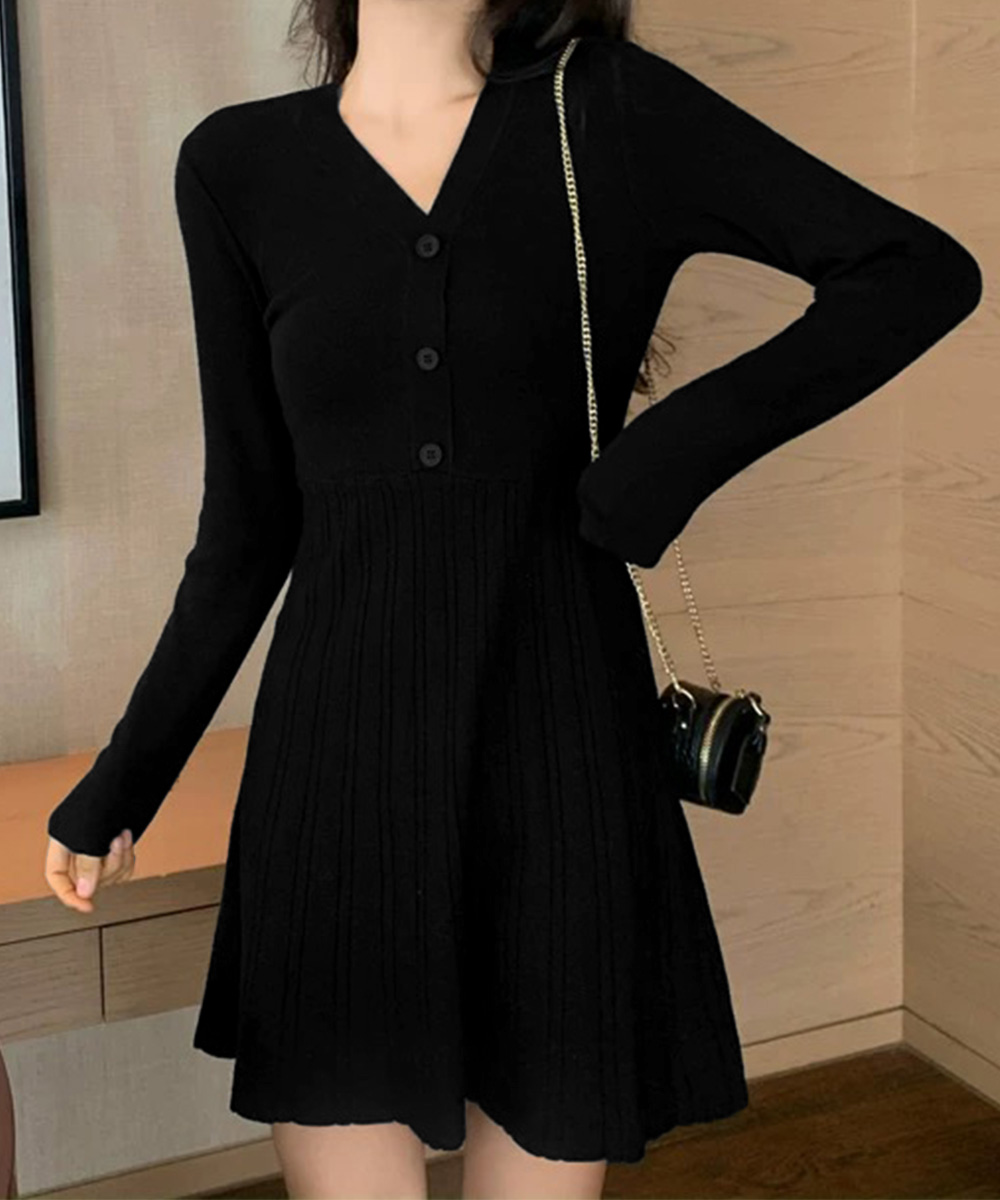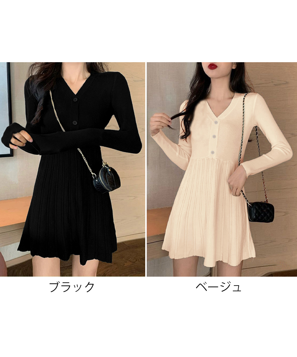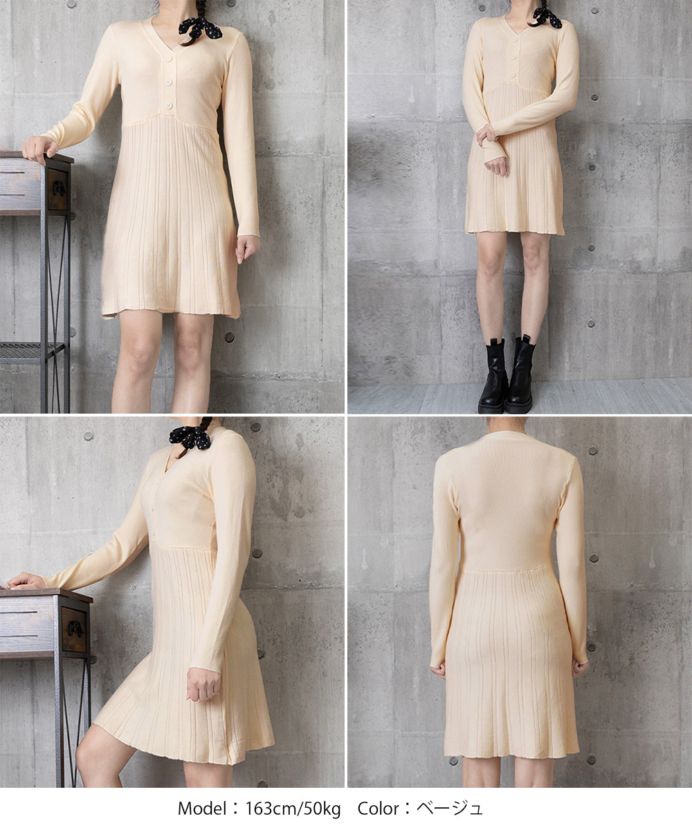 胸元の飾りボタンが上品なアクセントのVネックニットワンピース。