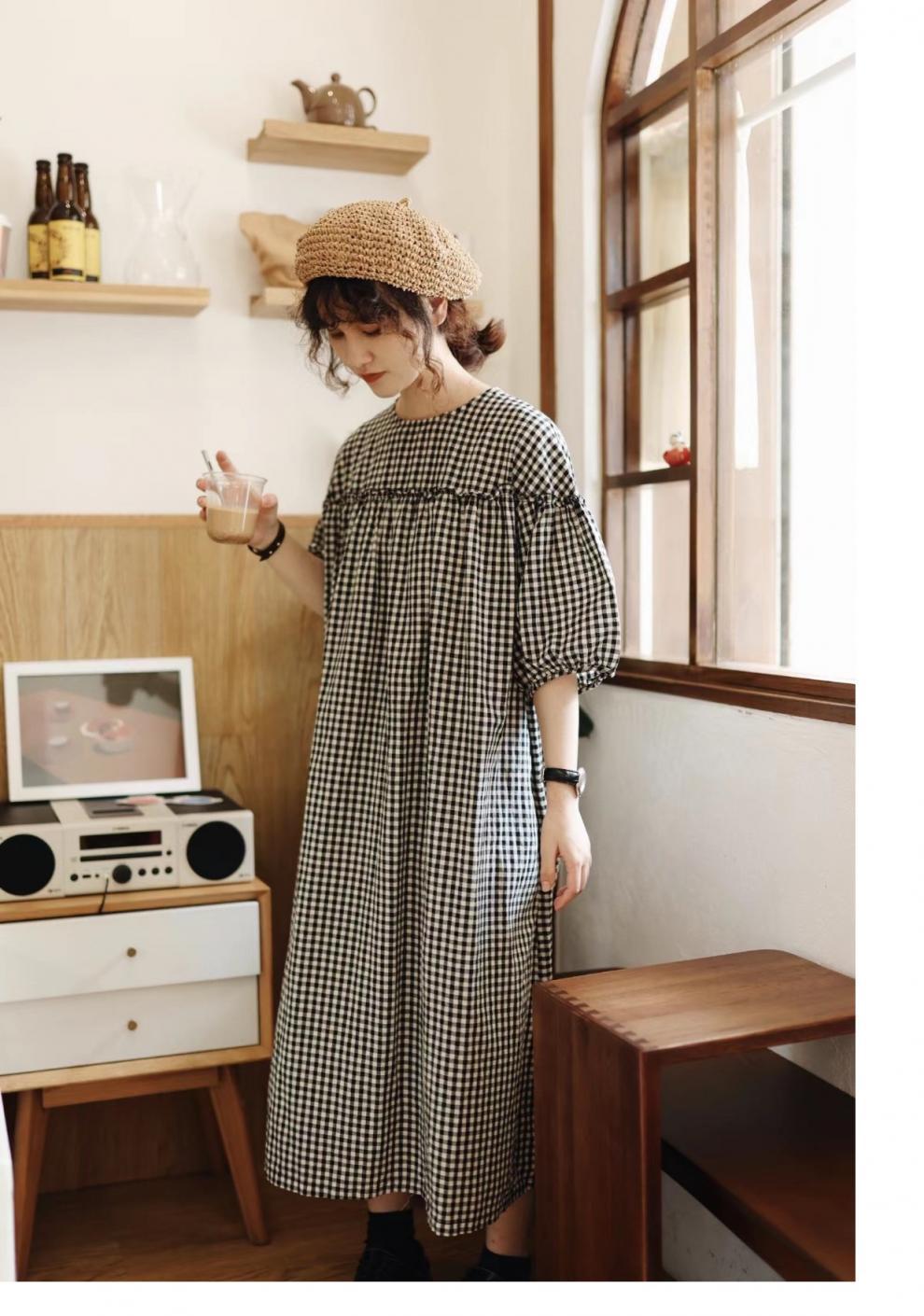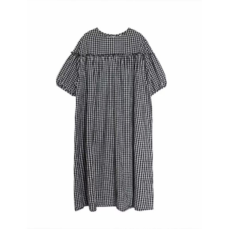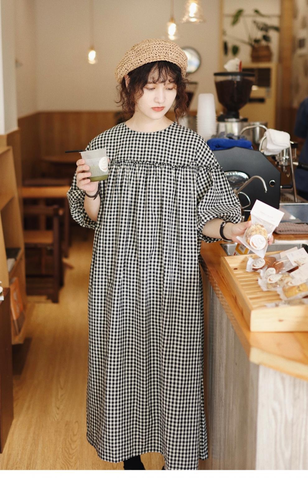 上品なギンガムチェック柄とゆったりシルエットで、妊婦さんにもおすすめ。