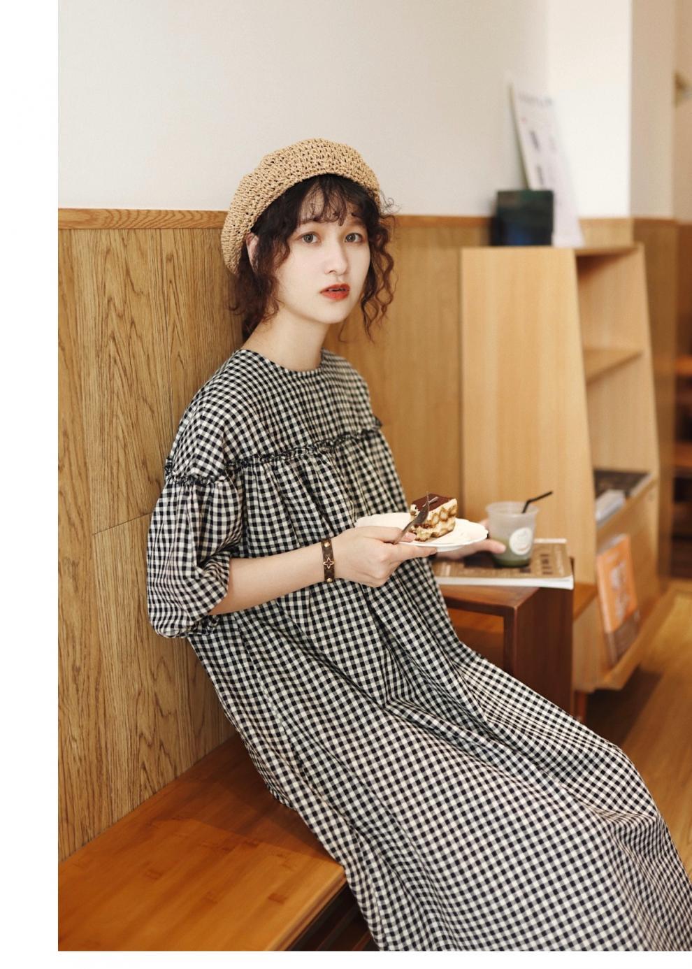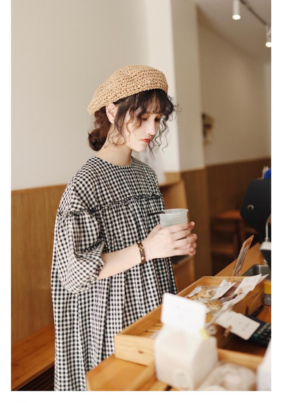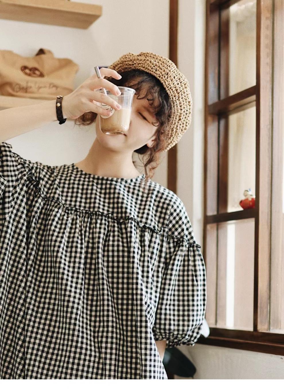 上品なギンガムチェック柄とゆったりシルエットで、妊婦さんにもおすすめ。