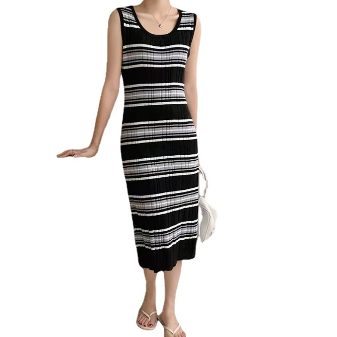 モノトーンのボーダー柄が上品で、ロングワンピースとして一枚で決まる優秀アイテム。