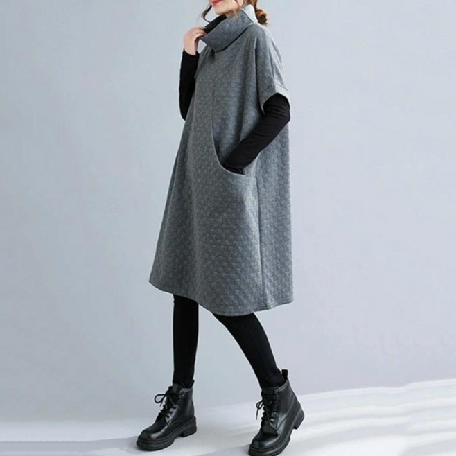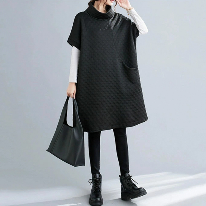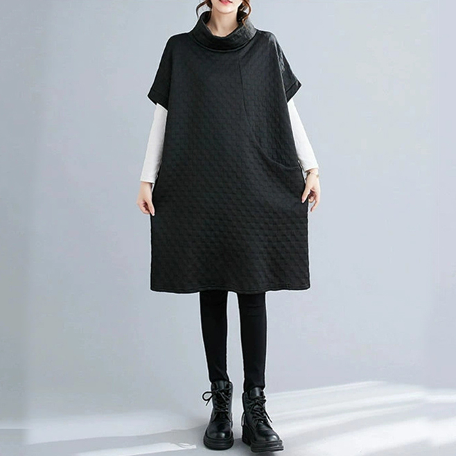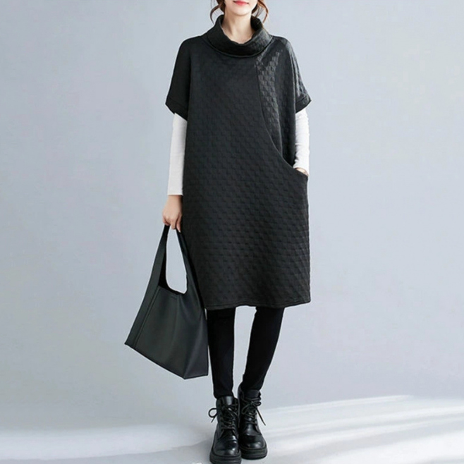 ■コメント ・ボディラインを拾わず、気になるお腹周りやヒップ周りもカバーしてくれます。 ・柔らかく肌ざわり◎、快適な着心地。 ・落ち着いた定番カラー黒、グレーの2カラーバリ。 ・中にインナーを重ね着して楽しめる半袖。 ・首元から腰に向かって斜めの縫い目が入って着痩せ効果も期待できます。 ■サイズ(単位:約cm) フリーサイズ 総丈91 バスト134 ■カラー 画像の通り ■伸縮性 なし ■裏地 なし ■生地の厚さ 普通 ■透け感 なし ■素材 ポリエステル100%