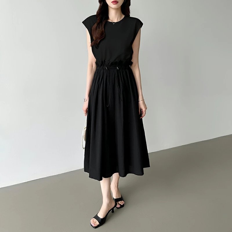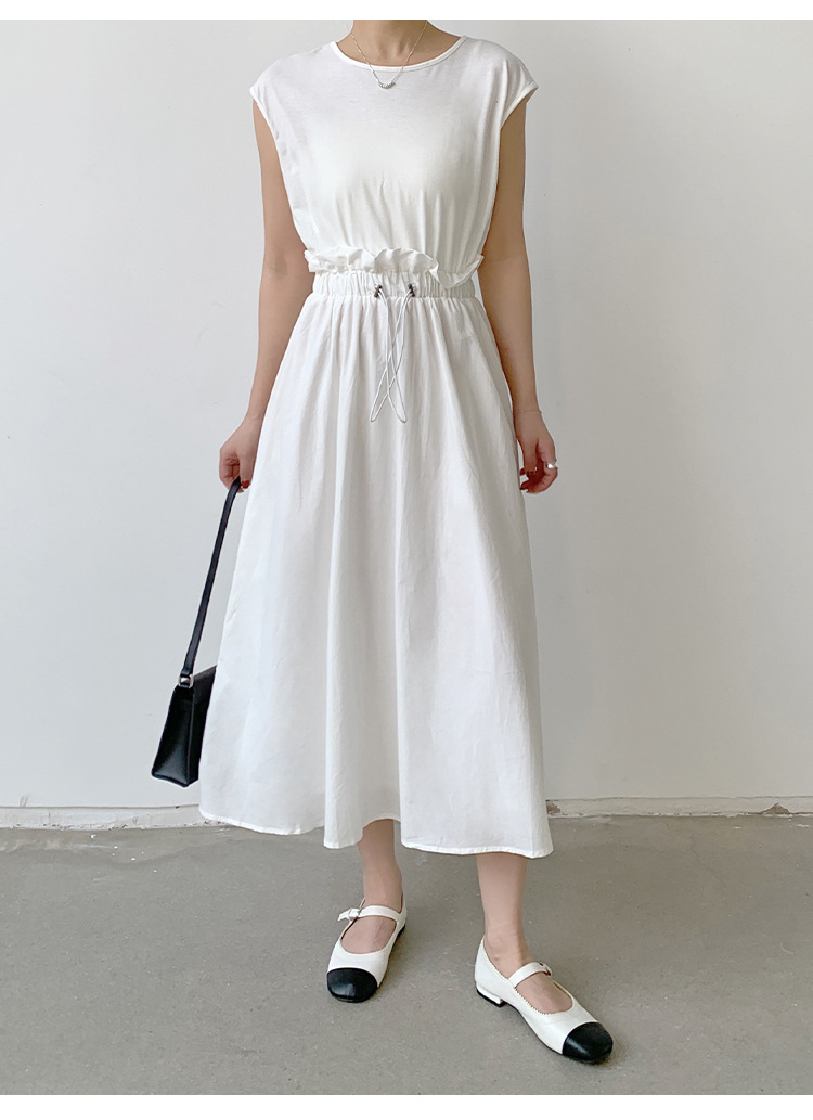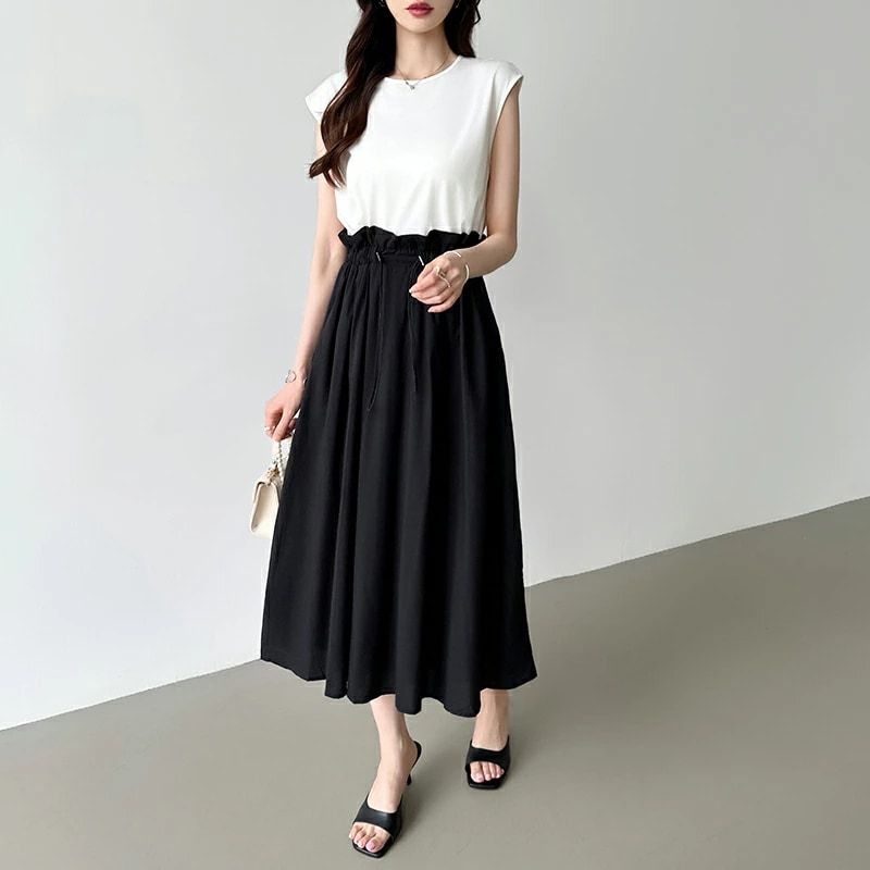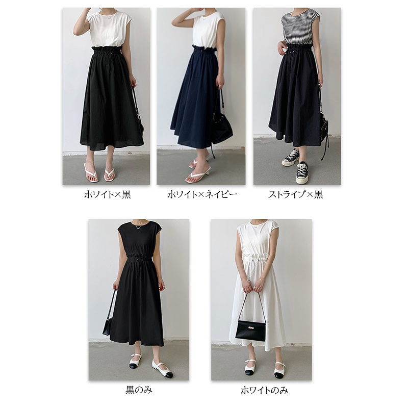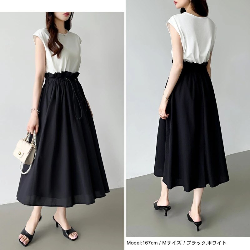 今季注目のノースリーブ異素材切替デザインが魅力的なロングワンピース。