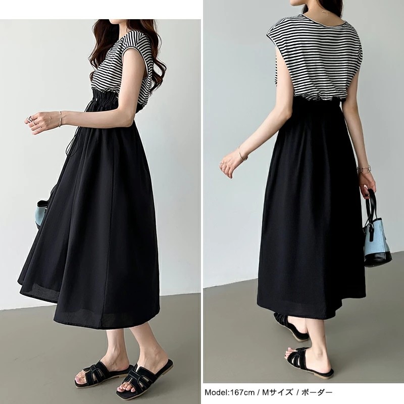 上品なボーダー柄とシンプル無地の組み合わせで、一枚でこなれ感を演出。