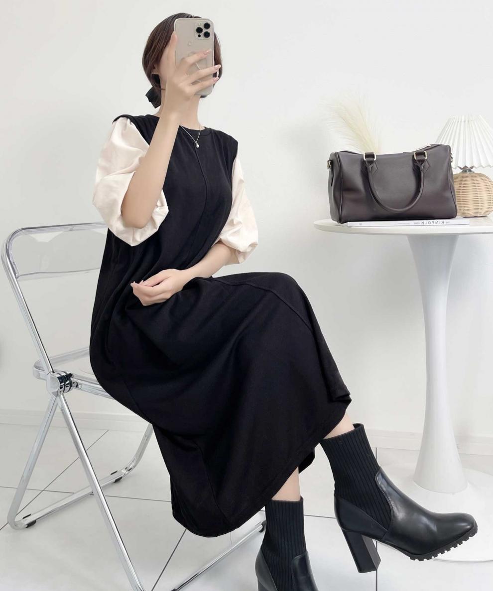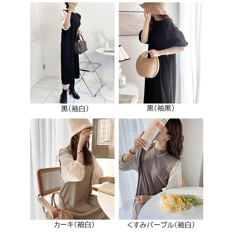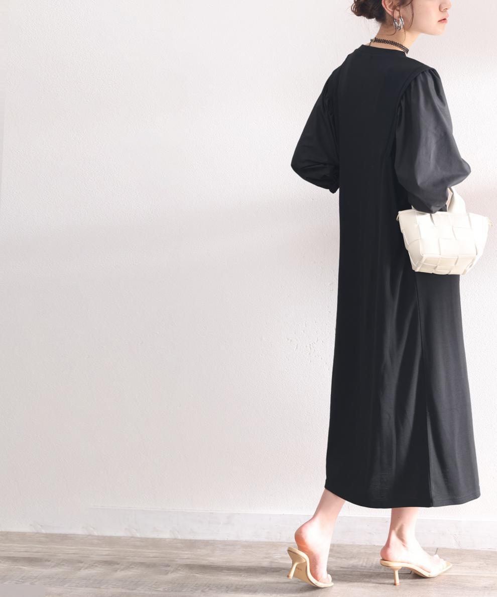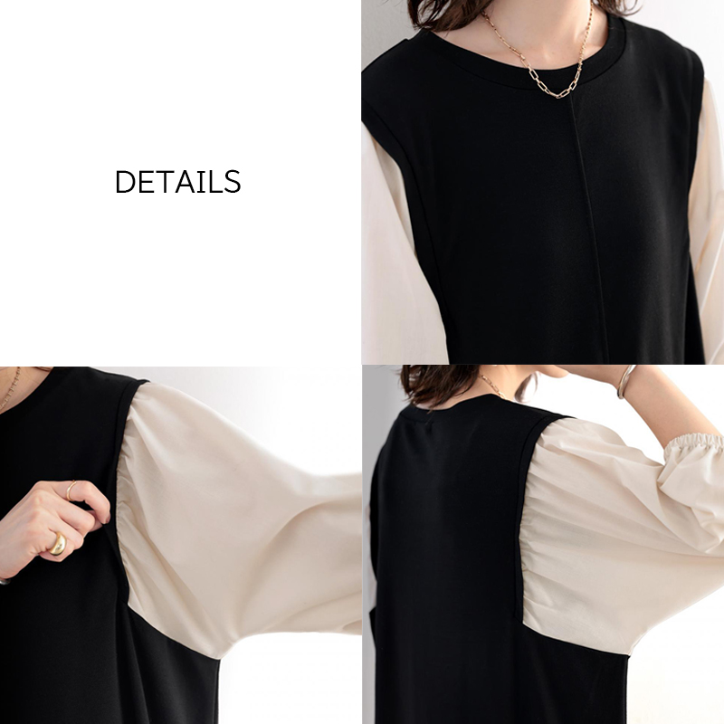 上品な異素材ドッキングデザインが魅力のマキシ丈ロングワンピース。