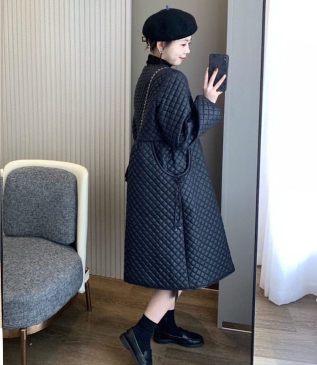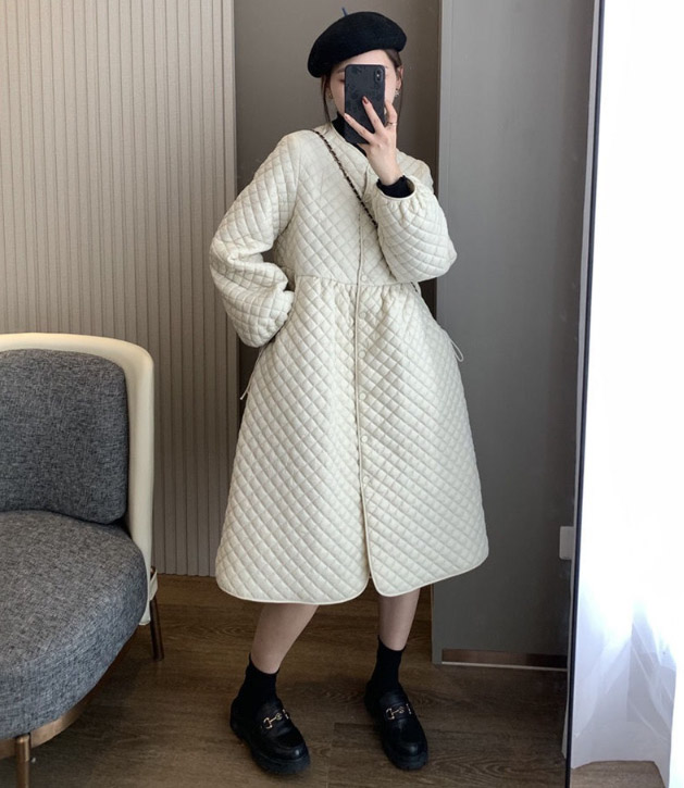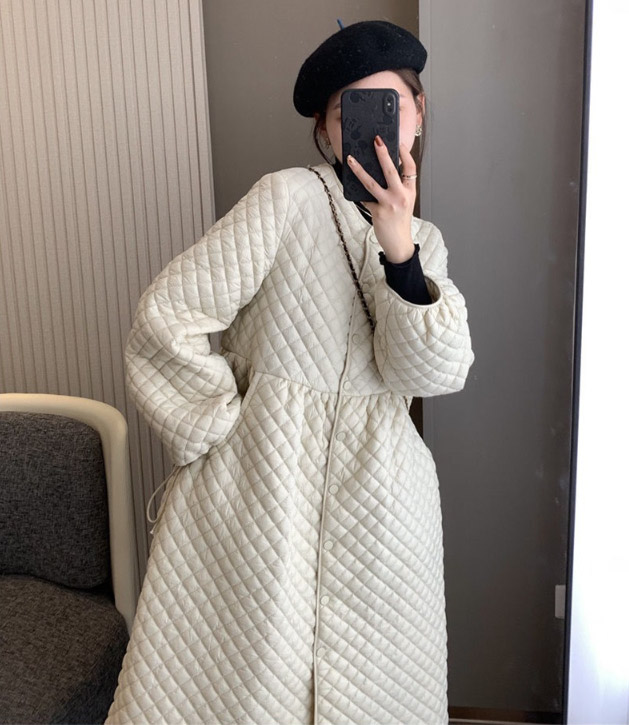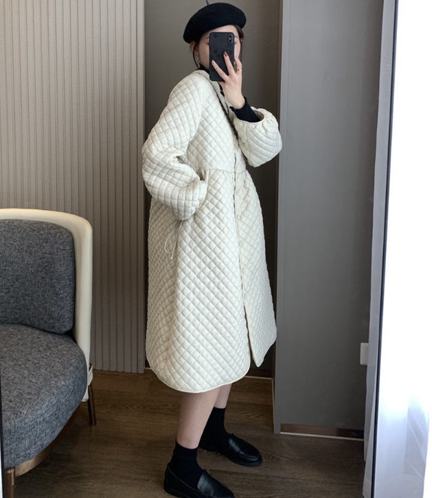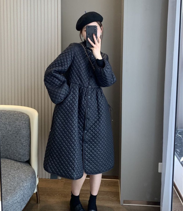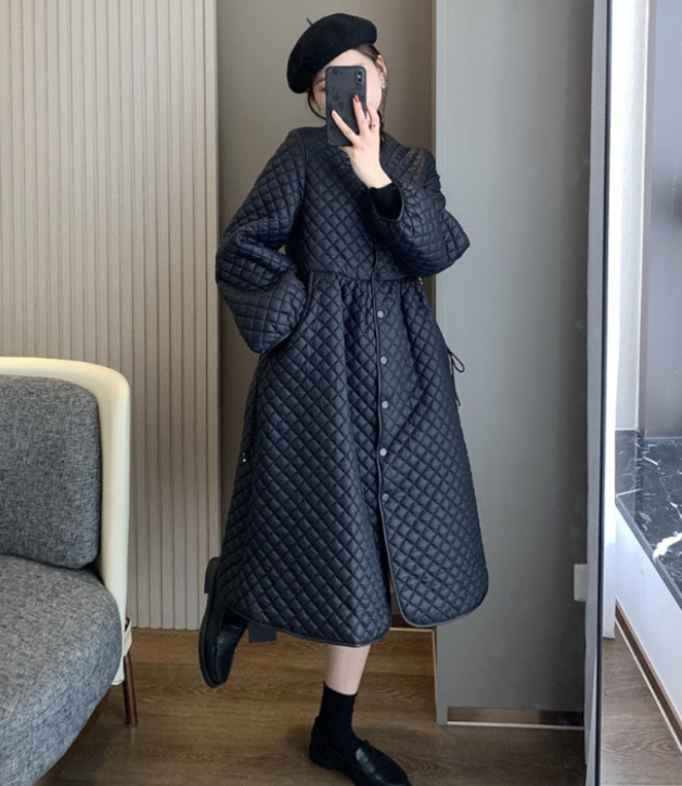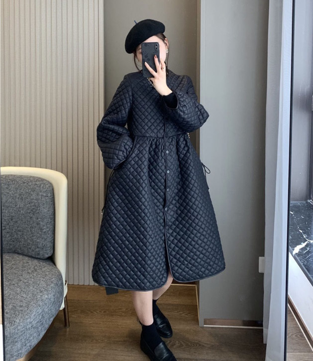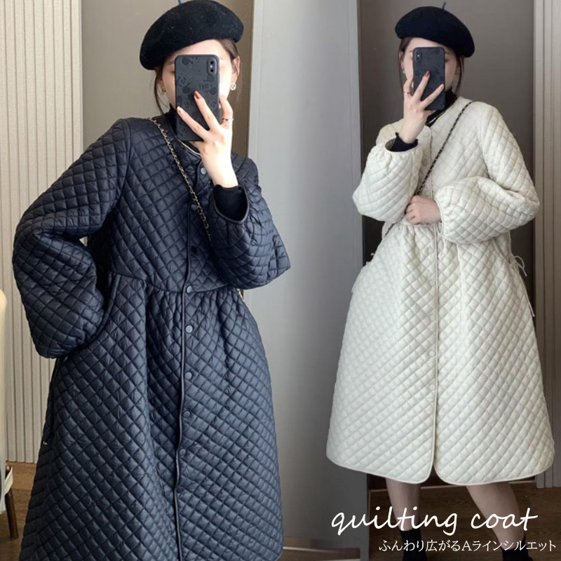 上品なキルティング素材のフレアシルエットが美しいロングワンピース風コートです。