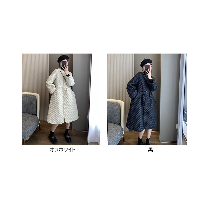 ※照明の関係により、実際よりも色味が違って見える場合があります。 またパソコン・スマートフォンなどの環境により、若干製品と画像のカラーが異なる場合もございます。予めご了承ください。 ※商品画像はサンプルのため、色味やサイズ等の仕様に変更がある場合がございますので、予めご了承ください。 ■コメント ・ふんわり広がるAラインシルエットのキルティングコート。 ・お顔回りがスッキリ見えするノーカラーコート。 ・ノーカラーなのでフードのついたトップスやハイネックなどとのレイヤードコーデが楽しめます。 ・中綿入りで着ぶくれしないのに暖かい。 ・ボディラインを拾いにくく体系カバーできます。 ・フロントを開けても閉じても可愛く着られます。 ■サイズ(単位:約cm) 普通(M) 総丈95cm 肩幅41cm バスト98cm 袖丈57cm(OK) ビッグ(2XL) 総丈113cm 肩幅44cm バスト116cm 袖丈60cm