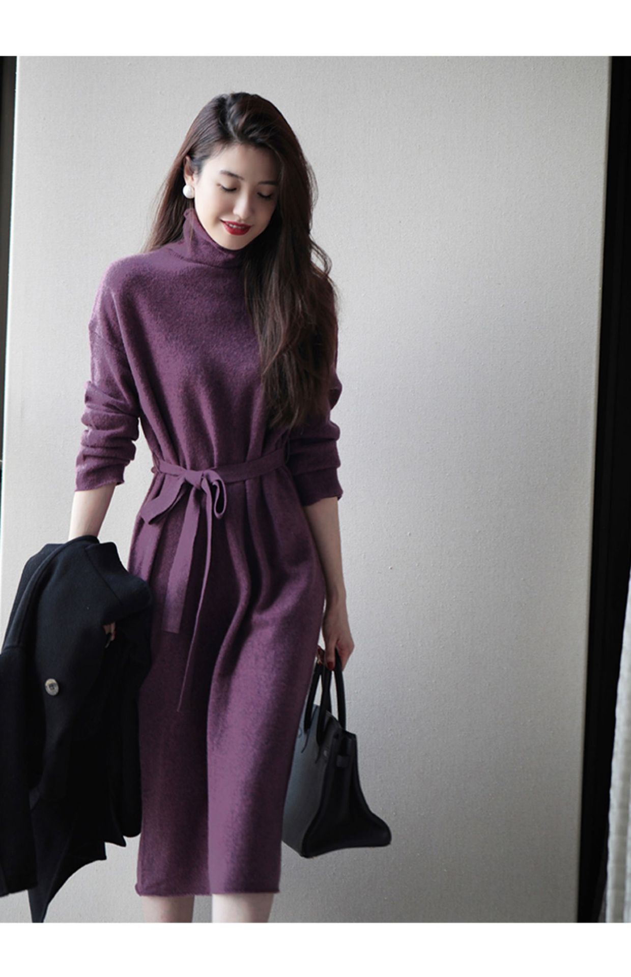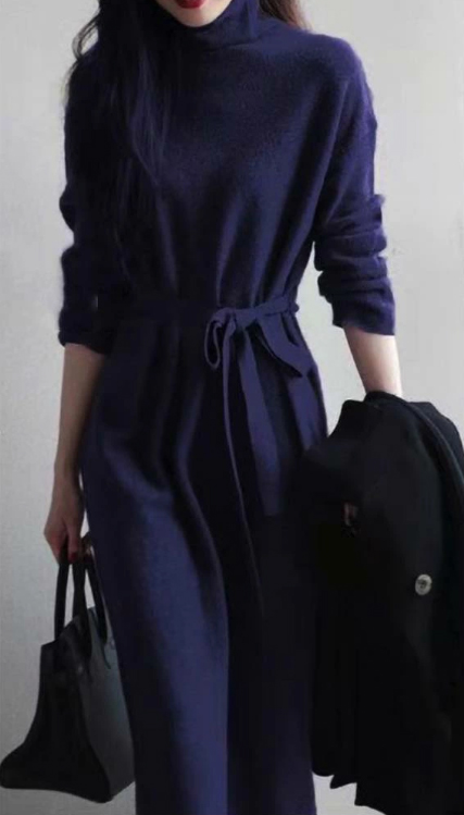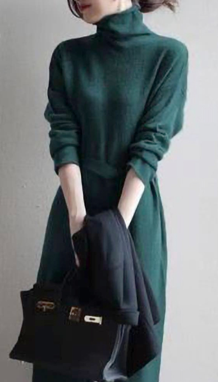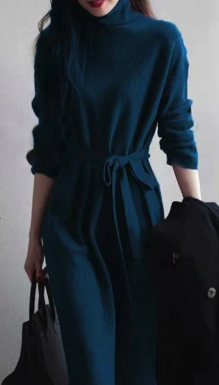 上品なタートルネックデザインのロングワンピースです。