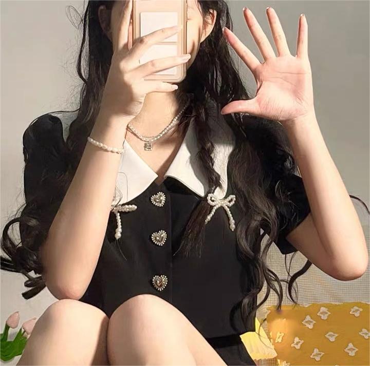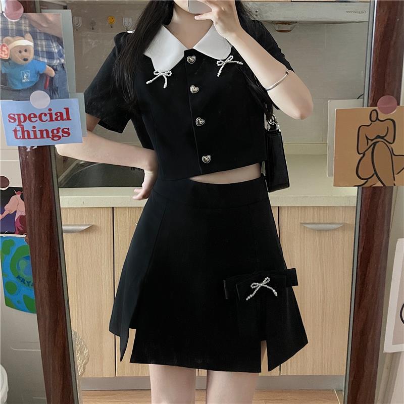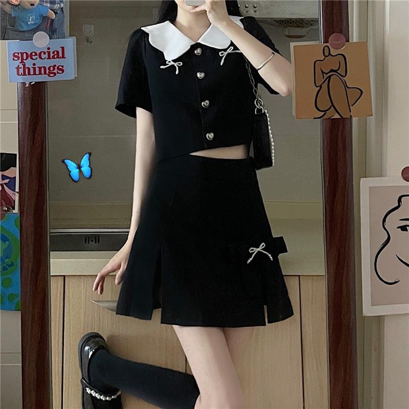 上品な白襟がポイントの黒ポロシャツ風セットアップ。