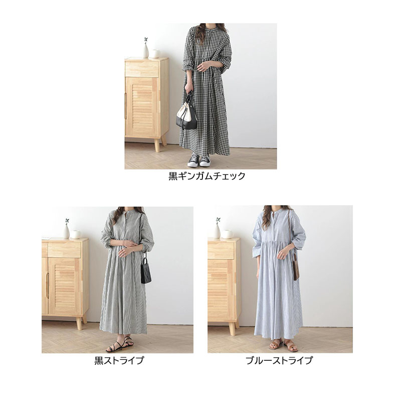 ■コメント ・元気な印象を与えてくれるギンガムチェック柄と爽やかなストライプ柄。 ・肌ざわりが良くサラッと着られます。 ・きれいめで上品なAラインシルエット。 ・たっぷりのギャザーデザインで動くたび揺れます。 ・ボディラインを拾いにくく体系カバーしてくれます。 ・窮屈感がなくリラクシーな着心地。 ・首元をスッキリ見せるバンドカラー。 ・お出かけやショッピング、通勤にも大活躍。 ■サイズ(単位:約cm) ワンサイズ 総丈:125cm /バスト:110cm / 肩幅:43cm / 袖丈:58cm ■カラー 画像に記載 ■伸縮性 なし ■裏地 なし ■生地の厚さ 普通 ■透け感 なし ■素材 ポリエステル65%、綿35%