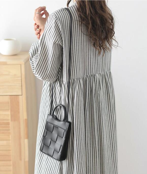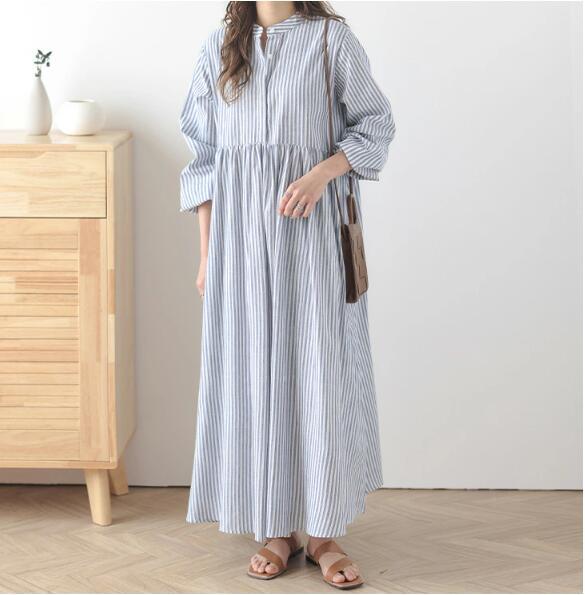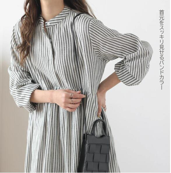 今年注目の縞模様が美しいシャツ型ロングワンピース。