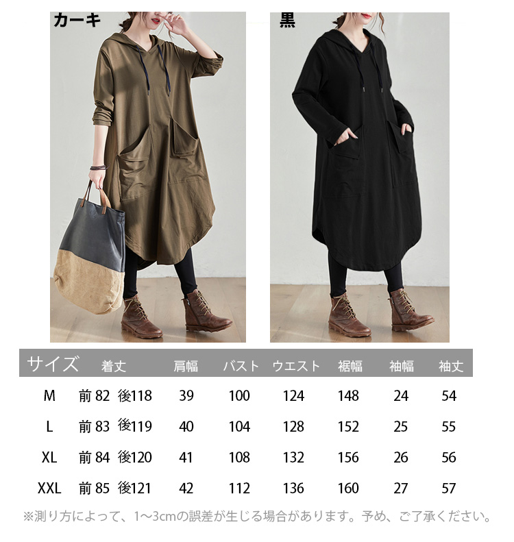 ■コメント ◇ポイント◇ 1.ふんわりビックシルエットのデザインで体系カバー 2.大きめのデザインポケットでバランス抜群 3.裾が丸い設計で、脚がきれいに見え、レギンスファッションも行けちゃう♪ ◇スタイリング◇ 今ぽくナチュラルにラフに着こなせるフード付きワンピース。 ワンピースとしてもチュニックとしても着て頂けます。 全体的ナチュラルな雰囲気で、1枚でコーディネートできる商品です。 日常はもちろん、今ぽくワンマイルコーデにもおすすめです。 ■サイズ(単位:約cm) 画像に記載 2XL前97 後129(OK)L前94 後111 肩幅45(OK) ■カラー 画像に記載 ■裏地 なし ■生地の厚さ 普通 ■透け感 なし ■素材 綿65%、ポリエステル35% ■重量 ■包装状況 OPP袋