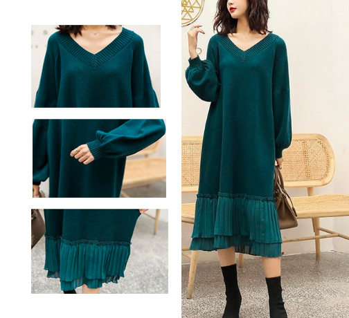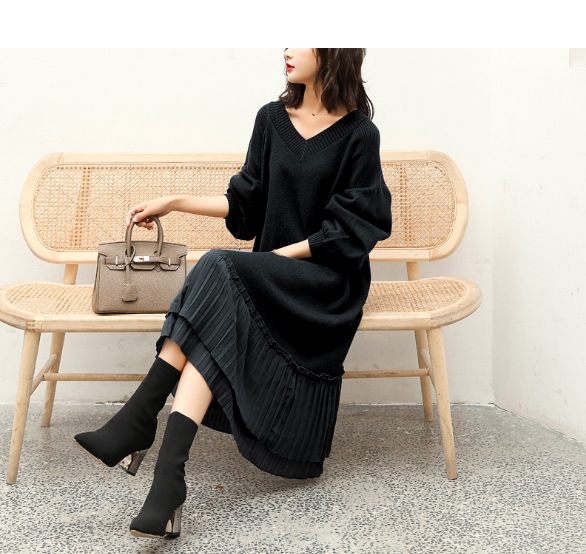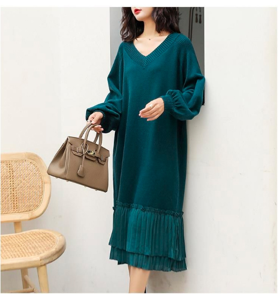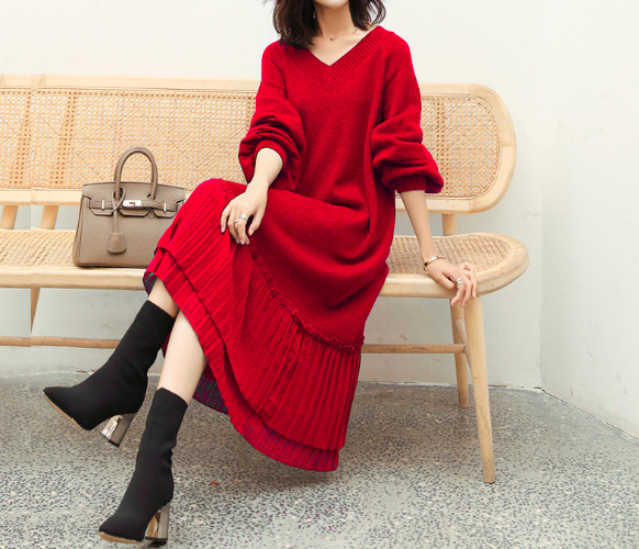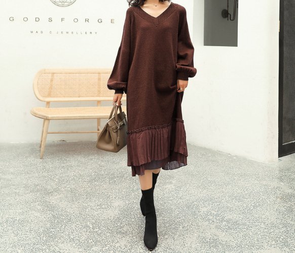 上品なブイネックデザインが印象的なニットロングワンピース。