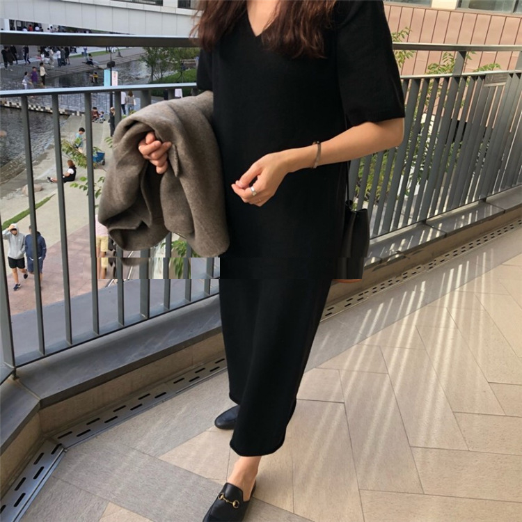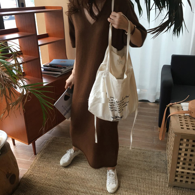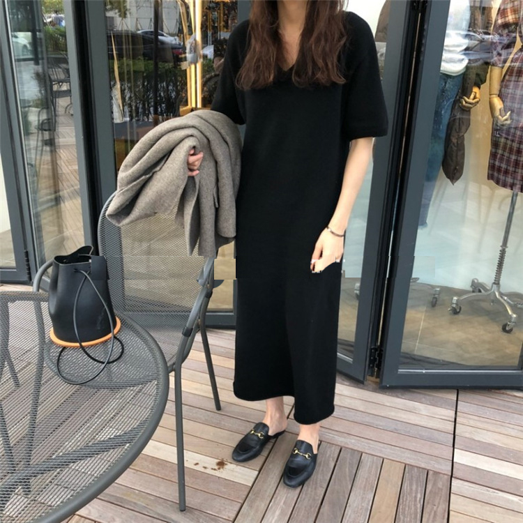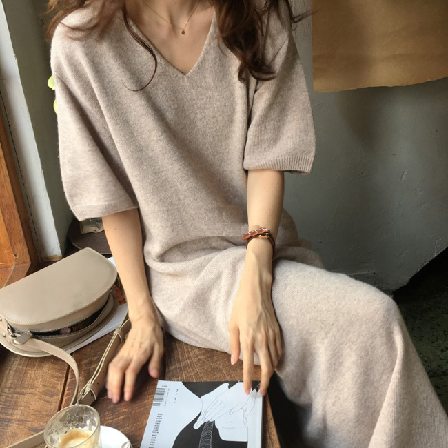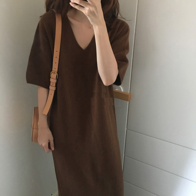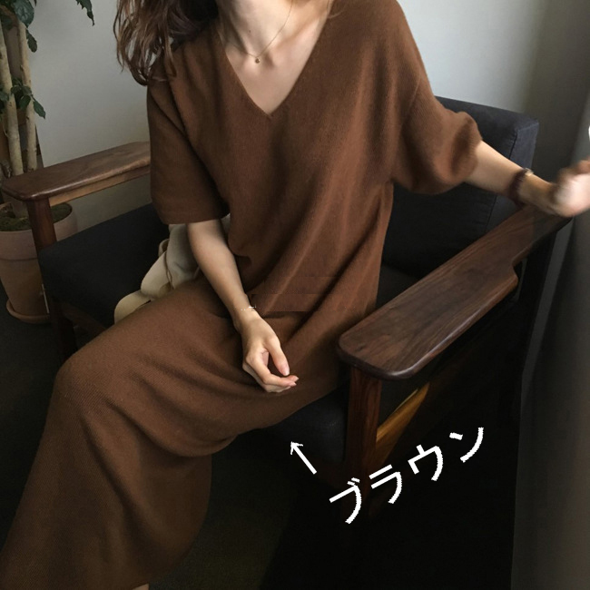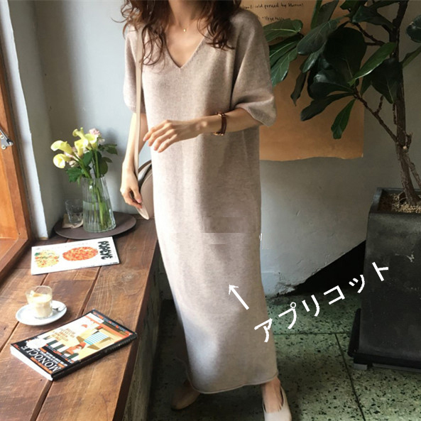 ※モデルさんの画像と実物の丈感が10cmほど短くなっています。 ■コメント 厳選された良いニット生地を使用、肌心地の良いロングニットワンピースです。 真っすぐにすとんと落ちるデザインで、隠しシルエットなのでやせて見えます。涼しげな大き目のVネック、肘までくる半袖なので、全体的なバランスが良く、着やせ効果があります。使いまわしのきくシンプルカラーをご用意、おすすめのマストアイテムです。 ワンピース一枚でもコーディネートできる優れもの☆毎日何着るか迷わず、これ一枚でコーディネート完成です。もちろん、中にジーンズやプリーツスカート、ニットパンツ、レギンスなどを合わせて来てもトレンド感あり、おしゃれです。ナチュラルなベーシックな雰囲気ですが、ベルトをしてさらに女性らしい雰囲気も演出できます。 日常着はもちろん、通勤通学、飲み会、同窓会などいろんなシーンで活用できます。 ■サイズ(単位:約cm) FREE 着丈94、肩幅56、バスト100、袖丈23 ■カラー ブラック、アプリコット、ブラウン ■伸縮性 あり ■裏地 なし ■生地の厚さ 普通 ■透け感 なし ■素材 アクリル64%、ナイロン16%、綿12%、ウール8%