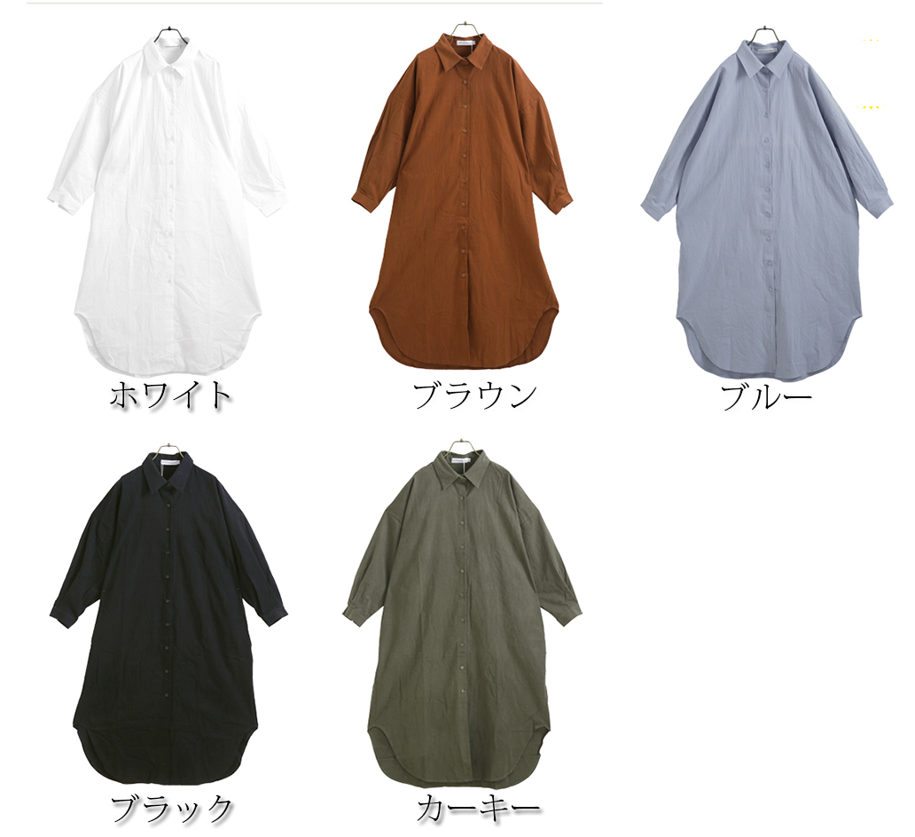 ■コメント 肌心地の良いロングシャツワンピースです。 ふんわりとした大きめのシンプルなデザインで、カラーも定番カラーをご用意、おすすめのマストアイテムです。 ワンピースとして、ボタンを全部外して羽織り物としても着れます。 全体的ナチュラルな雰囲気ですが、ベルトをしてさらに女性らしい雰囲気も演出できます。 日常着はもちろん、通勤通学、飲み会、同窓会などいろんなシーンで活用できます。 ■サイズ(単位:約cm) M:着丈108cm、裄丈62cm、バスト118cm 袖丈48cm 肩幅 56cm(OK) L:着丈110cm、裄丈63cm、バスト122cm 袖丈49cm 肩幅 57cm(OK) XL:着丈112cm、裄丈64cm、バスト126cm 袖丈50cm 肩幅 58cm(OK) 2XL:着丈114cm、裄丈65cm、バスト136cm 袖丈51cm 肩幅 59cm(OK) ■カラー ホワイト、ブラウン、ブルー、ブラック、カーキー ■伸縮性 ■裏地 なし ■生地の厚さ 普通 ■透け感 若干あり ■素材 コットン65%、ポリエステル35%