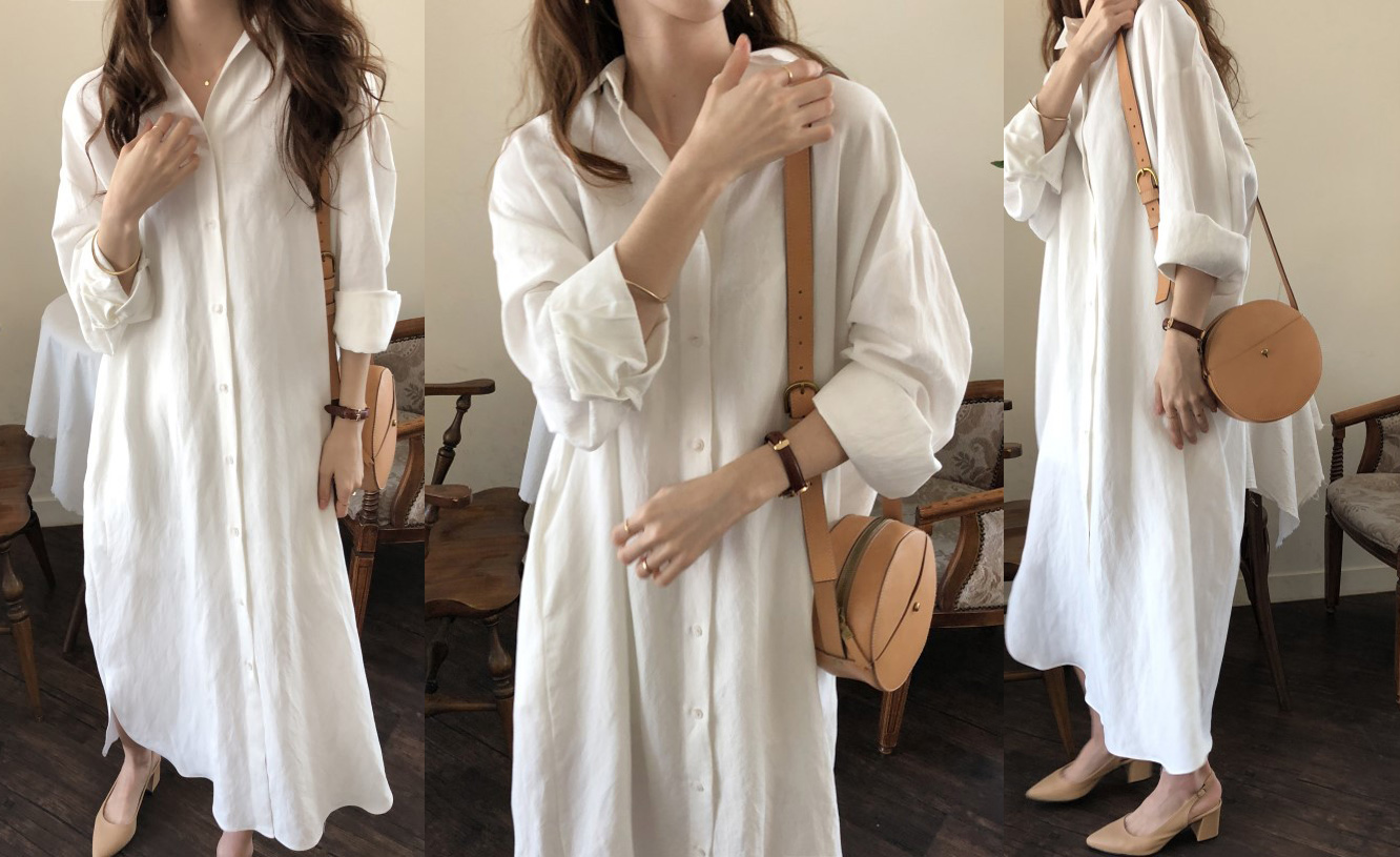 清楚で上品な白シャツタイプのロングワンピースです。