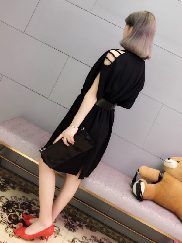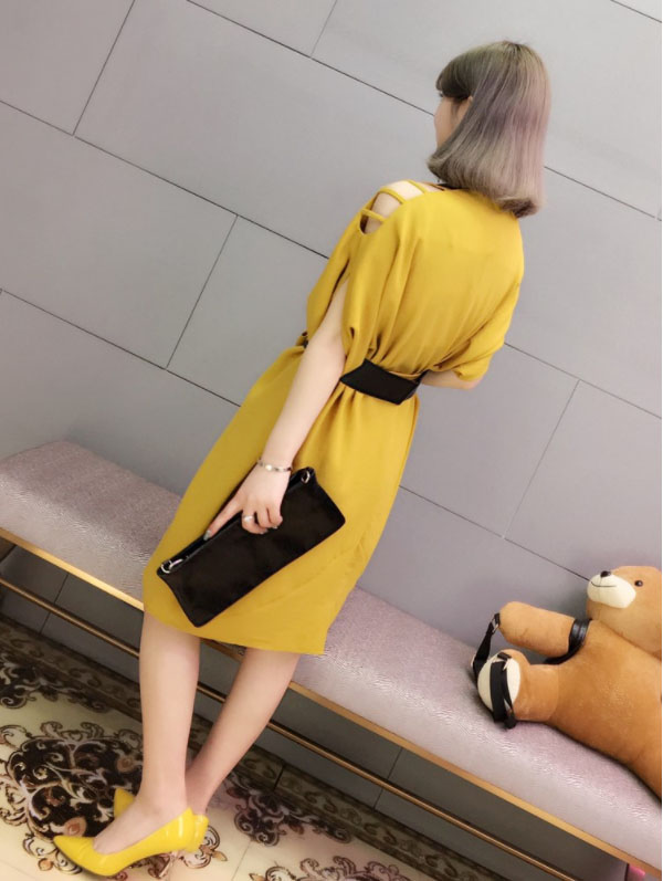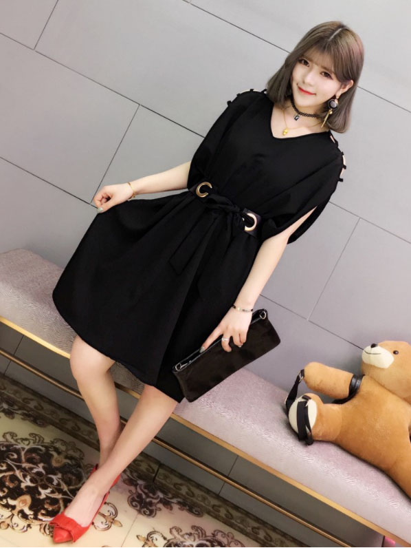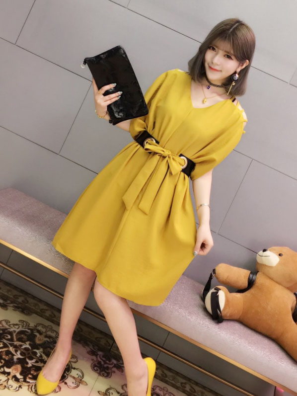 肩見せデザインで女性らしさを演出し、ウエストリボンで体型カバーも完璧。