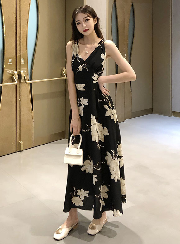 エレガントな花柄が美しい黒地のキャミワンピース。