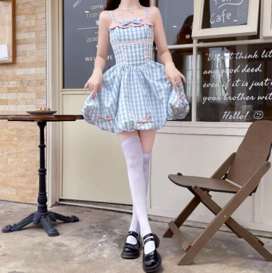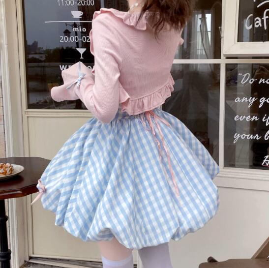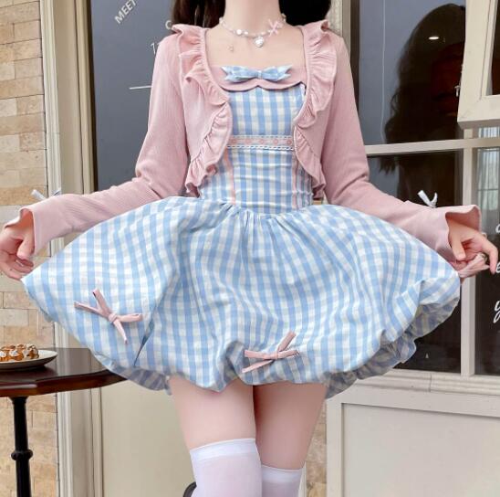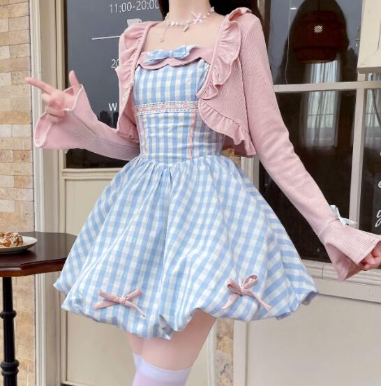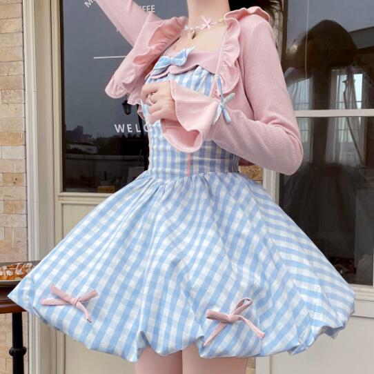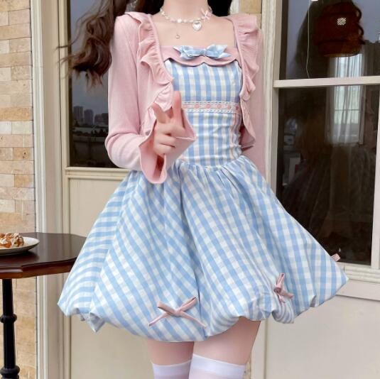 可愛いギンガムチェック柄のフレアワンピースとピンクカーディガンのセット商品です。