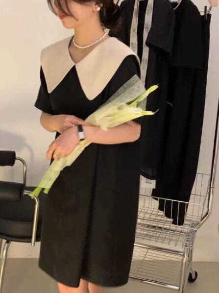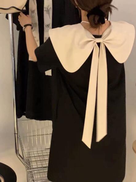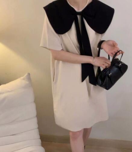 上品な白襟とリボンが印象的なフレア袖デザインのロングワンピース。