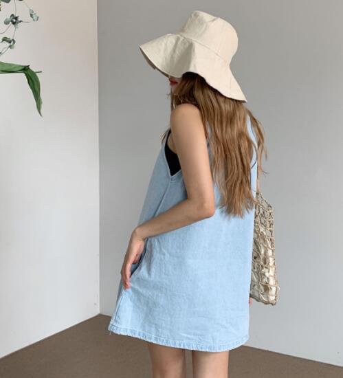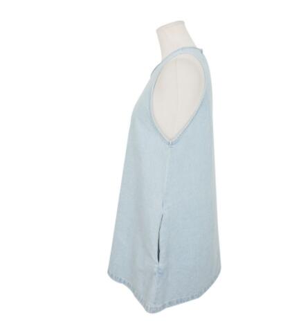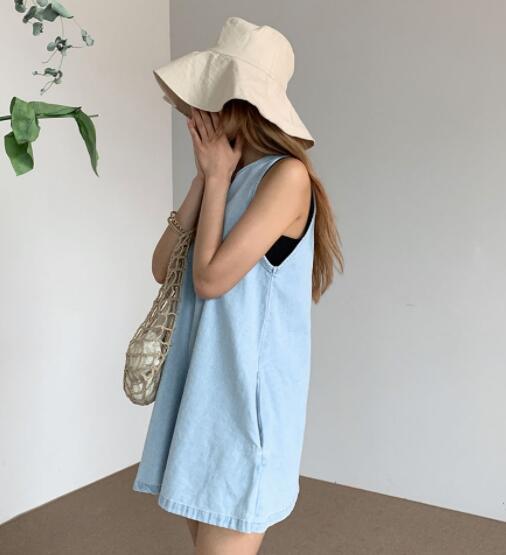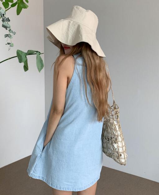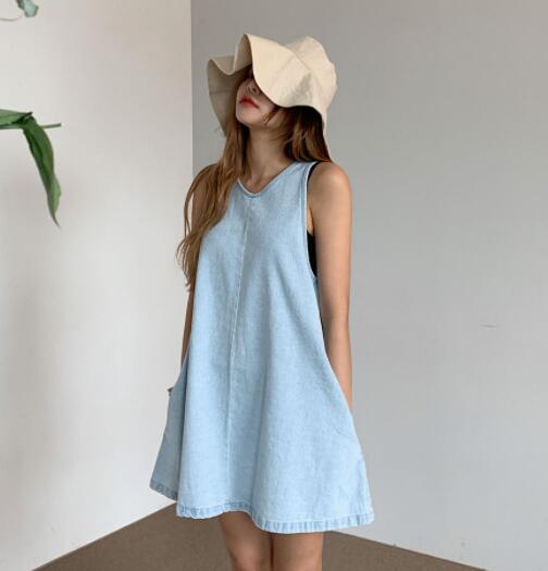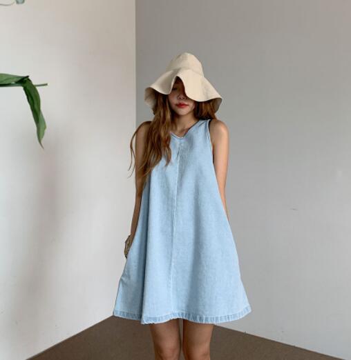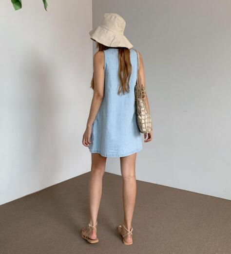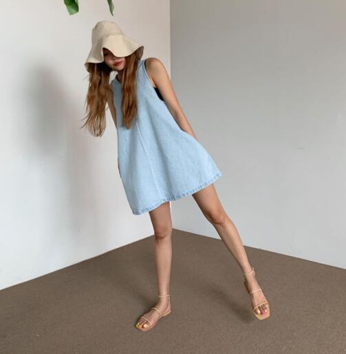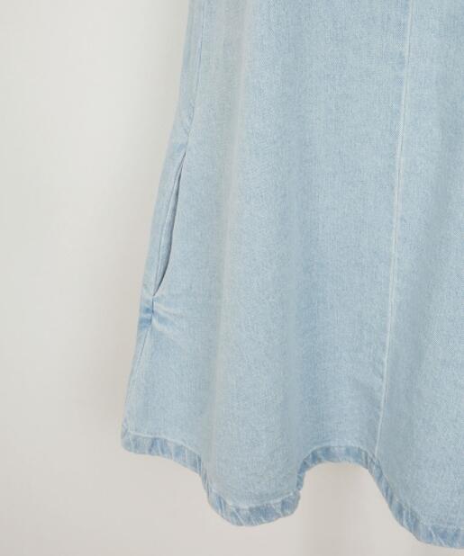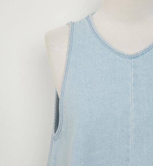 涼しげなライトブルーが魅力的なノースリーブデニムワンピースです。