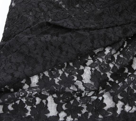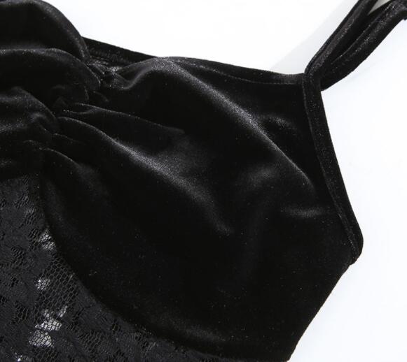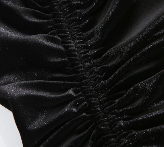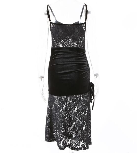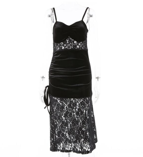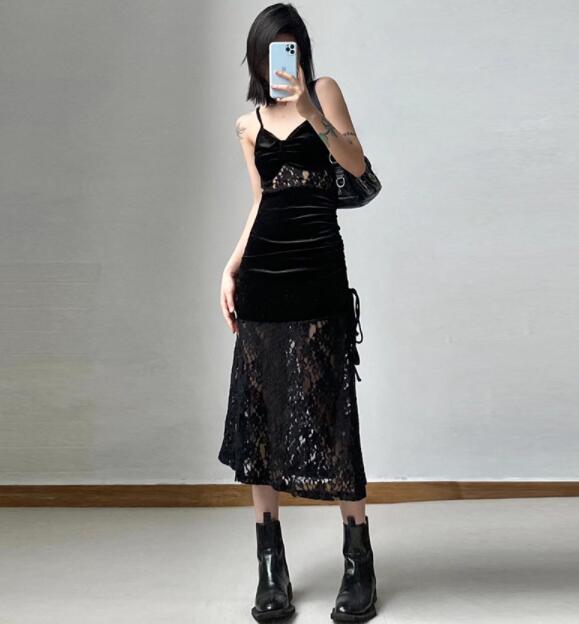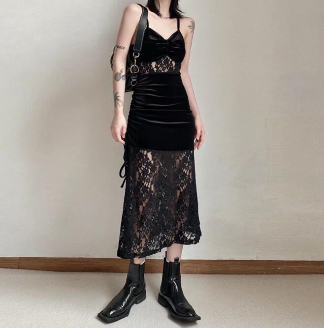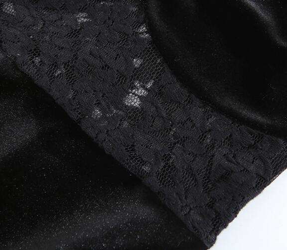 エレガントな黒のベルベット素材とレースを組み合わせたロングワンピース。